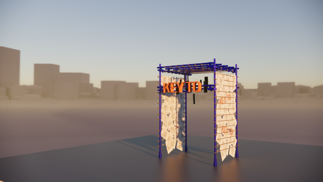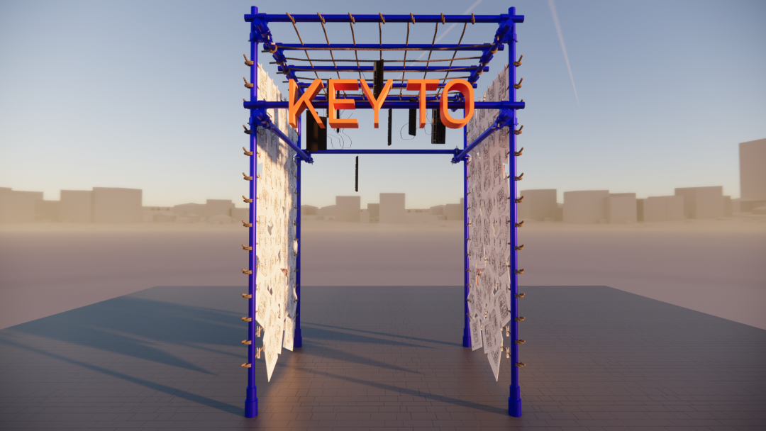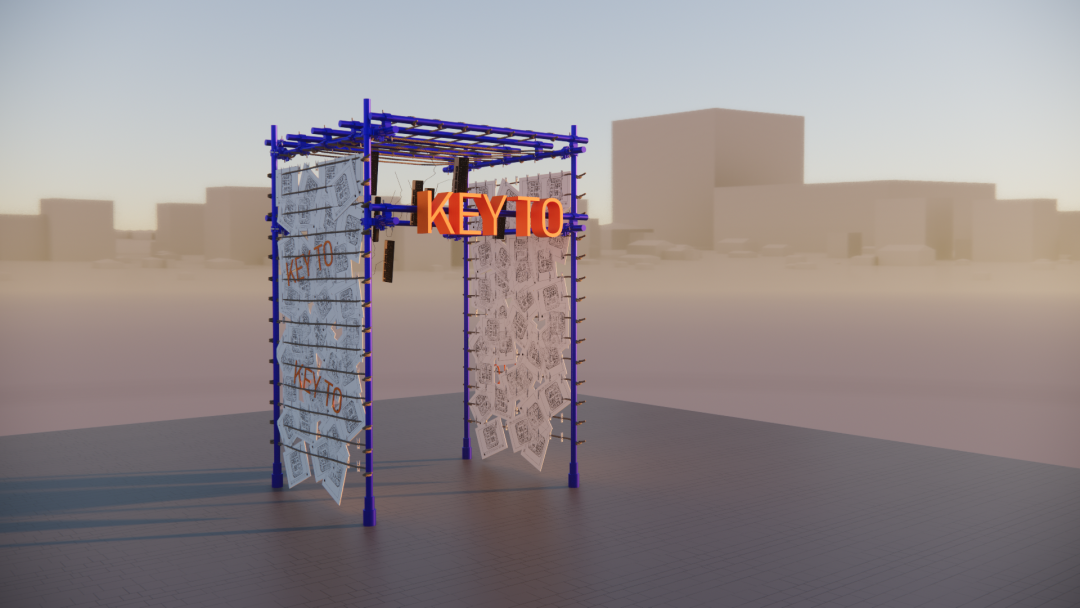 自CAD在设计行业普及之日起,设计师们更多得通过电脑键盘上的按键(key)架起通往(to/箭头与方向)最终蓝图的桥梁,于是“key to”成为本装置设计的核心,引出“键盘”与“图纸”的视觉意象。而非常巧合的,“key to”两个单词的发音,正一一对应了“开拓”二字的温州话发音,装置的主题词便由此定下。