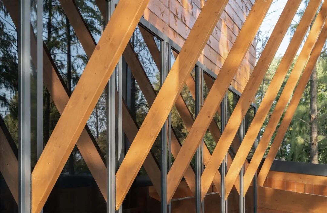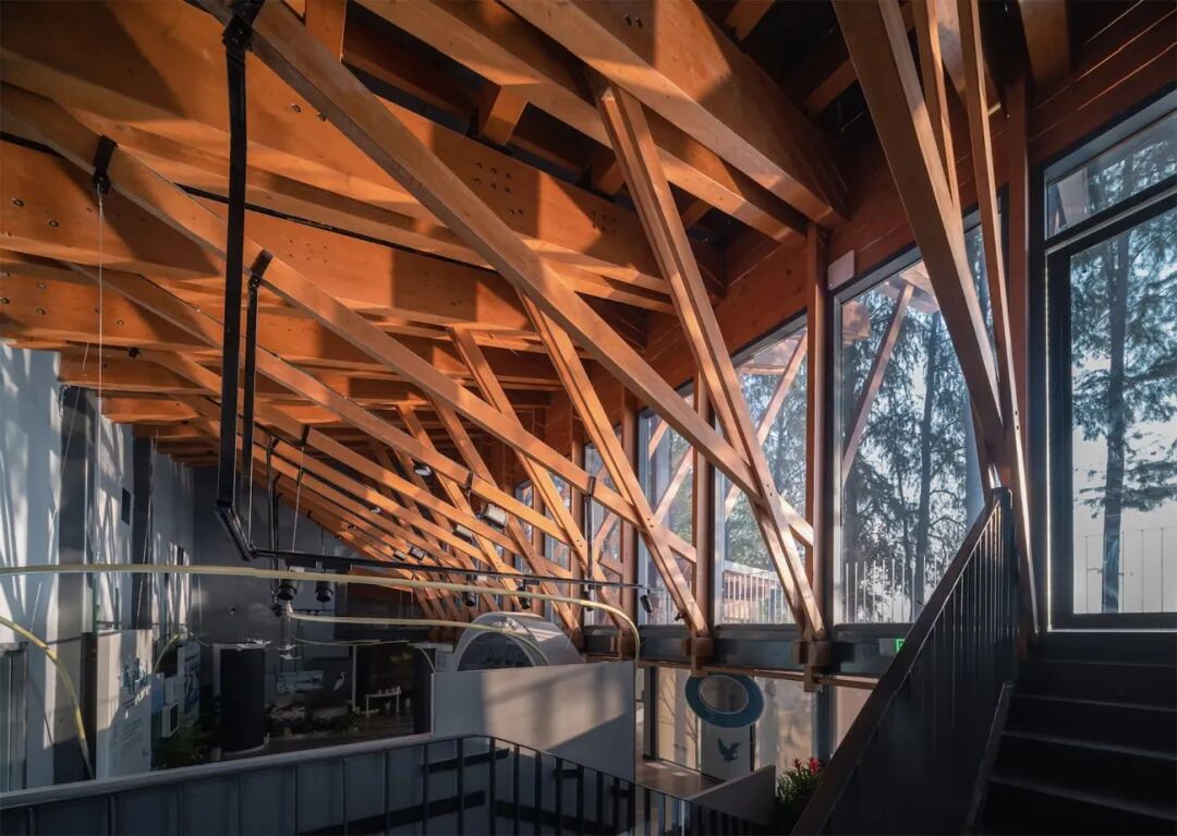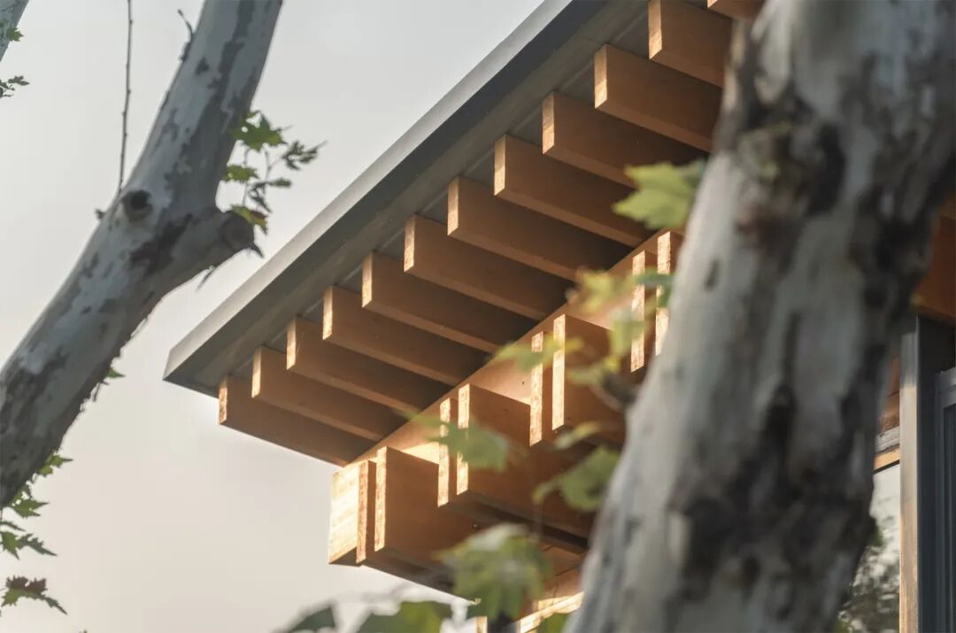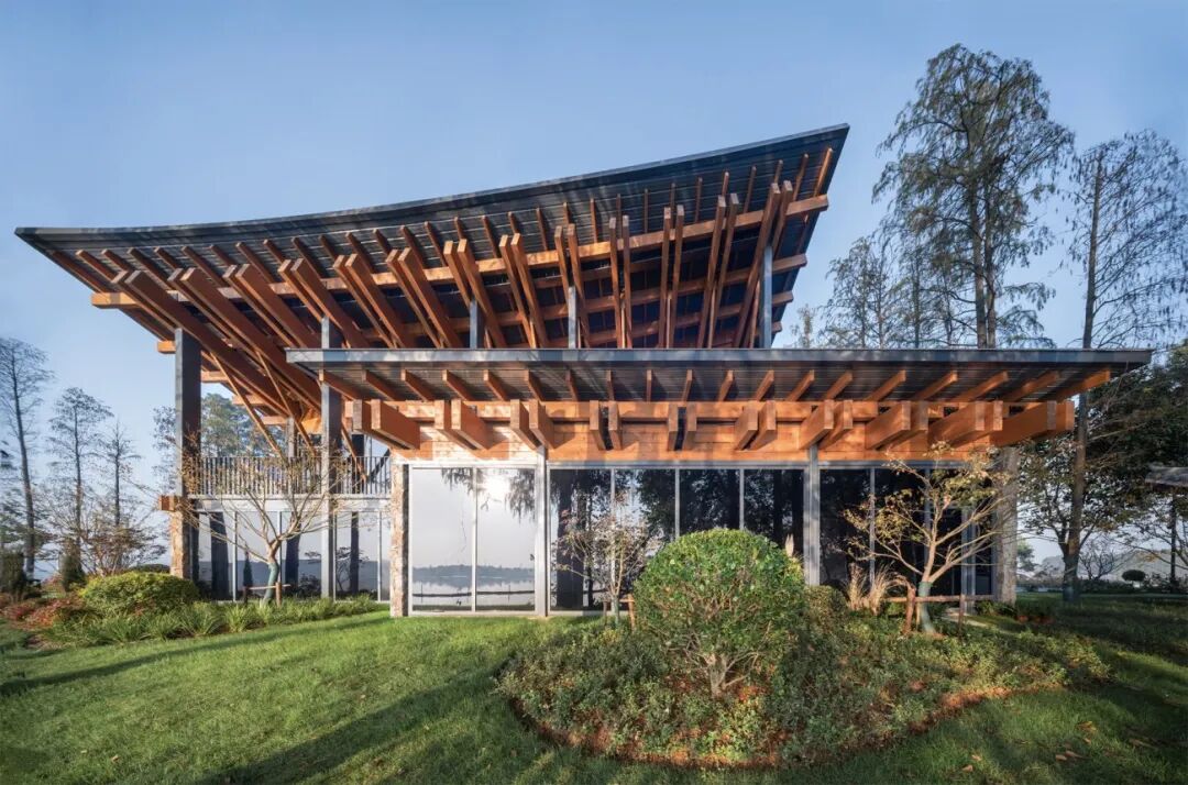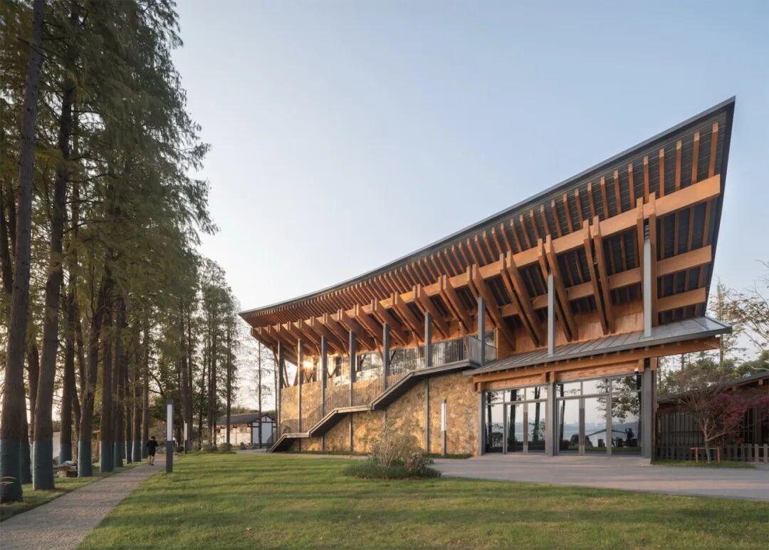 The double pitched roof of the original workshop is dull. The single pitched roof of the original staff canteen and kitchen is shabby. The flat roof of the original dormitory is incompatible with the beautiful East Lake environment. By referring to the shape of waterfowl wings and combining with the lift and fold curves of traditional Chinese wooden buildings, we designed a shed roof with deep eaves, and set a mezzanine in the higher side of slope facing the large lake to form a viewing platform. Following the “explore structure directly tradition”of ancient Chinese architecture,we deliberately exposed the entire structure to reveal the expressive wooden structure system under the eaves. After the construction was completed, some people saw the dynamic force of flying birds: wild trees covered the wild geese, fishing boats reflected the birds. Some people saw the shadow of chime bells unearthed in Hubei, and some people saw the metaphor of piano keyboard. Some people saw the characteristics of Chu culture. Some people saw the momentum of the nine-headed bird: nine-headed birds in the sky, Hubei guys on the ground. The polysemous interpretation of architectural form endows architecture with more connotation.