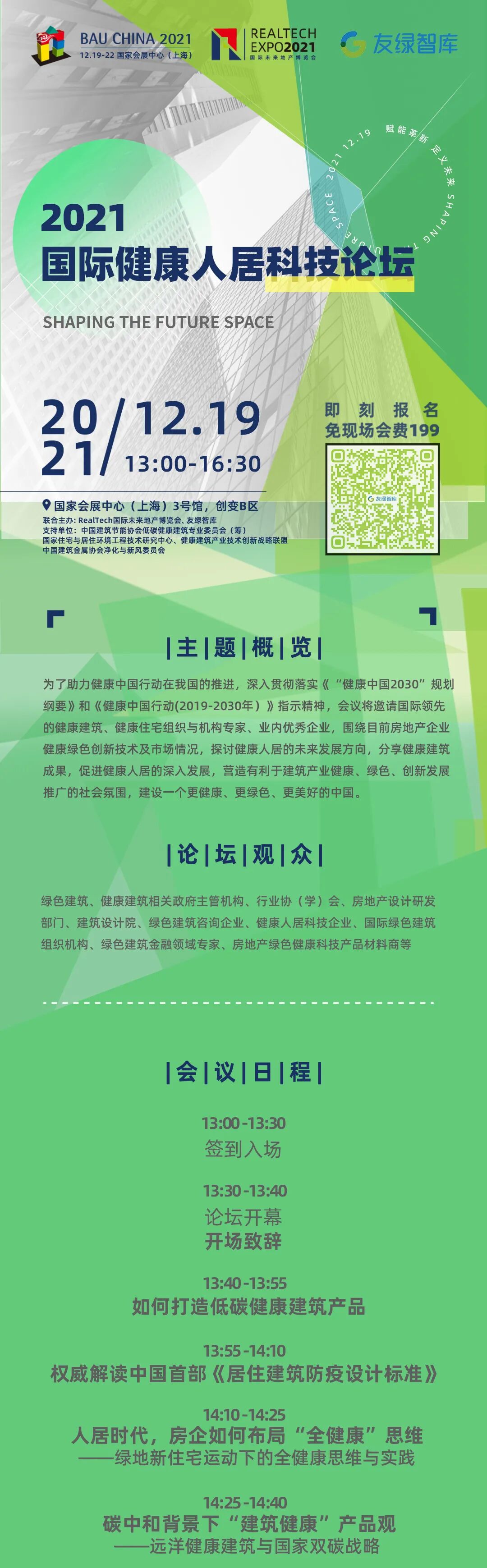 为贯彻落实党中央、国务院关于加快新时代经济建设与建筑产业的健康发展的要求,积极应对空气污染、新冠肺炎等环境和公共卫生事件的挑战,不断满足人民群众对美好生活的新需求,“RealTech国际未来地产博览会”将携手“友绿智库”于12月19日在上海国家会展中心(3号馆)举办一场为期半日的“RealTech创变论坛丨2021国际健康人居科技论坛”。