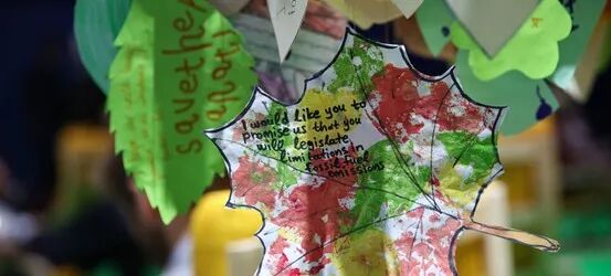 在苏格兰格拉斯哥举行的气候大会上,与会者在不同颜色树叶图形的纸上写下承诺和请愿书,提交给世界各国领导人。
