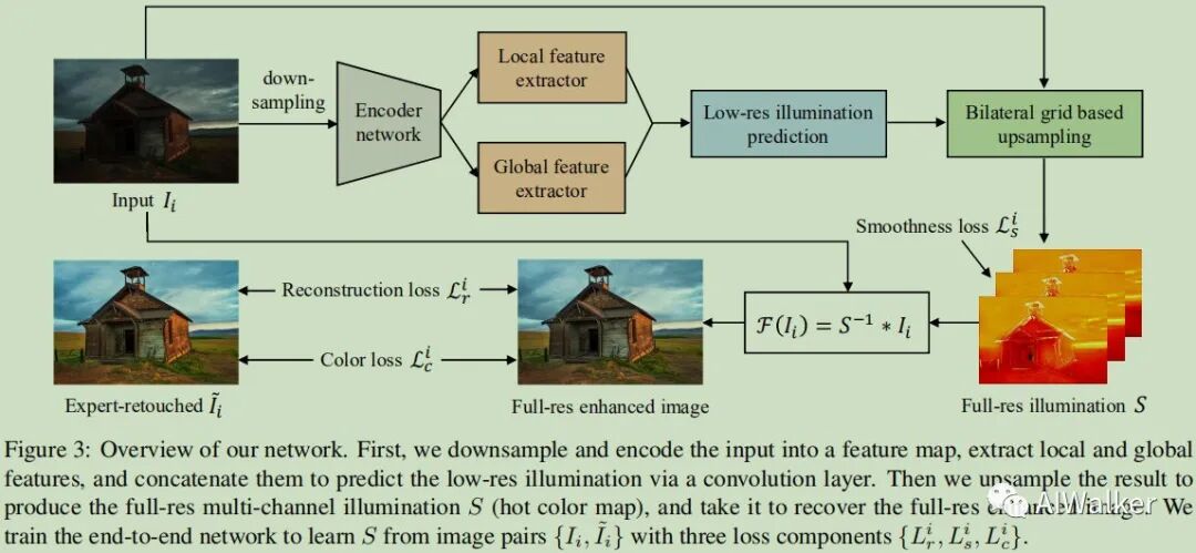 为计算计算,作者采用低分辨率局部与全局特征学习亮度图像,然后采用