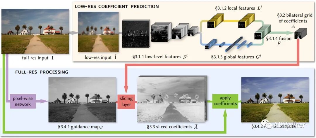 上执行,该部分用于预测类似Bilateral Grid的局部仿射变换。图像增强不仅依赖于局部特征,同时还依赖于全局特征。因而低分辨率流进一步划分为两个分支,最后融合两个分支的结果得到最终的仿射变换系数。