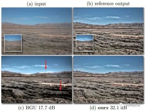 在运行时,该网络在低分辨空间学习双边空间内相关仿射参数,然后将这些参数采用保边形式上采样,最后将这些参数作用于全分辨率输入图像得到最终期望的输出。最终该算法可以在手机端以毫秒级处理高分辨率图像,对于