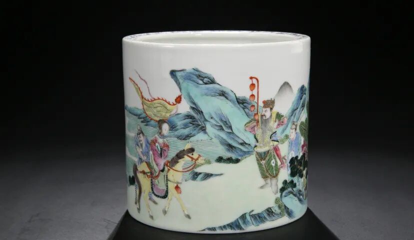 描述:此件清中晚·粉彩人物故事纹笔筒,敛口平沿,圆筒腹,玉璧底,器型规整,胎骨细密,身施白釉,釉质润白。整器品质极高,彰显其使用者情致、风韵兼具,品味高雅。