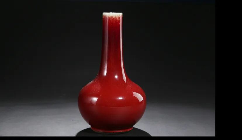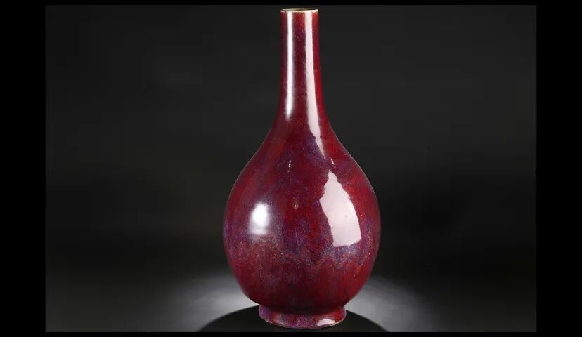 描述:此件清乾隆·窑变釉大胆瓶,直口,长颈,溜肩,垂腹,圈足。形似悬胆,端庄大方,挺拔隽秀,线条起伏流畅,为其造型增添秀美之姿。器外施窑变釉,釉面光洁,红釉流淌,迷离迤逦,妙得宋钧釉神韵。