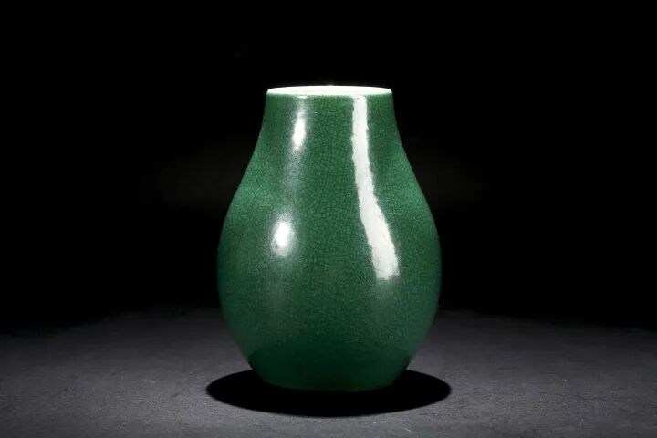 描述:此件民国·绿哥釉天球瓶一对,圆口,长颈,丰肩鼓腹,圈足。通体施绿哥釉,釉色清亮匀净,开片自然,满布全身。本品釉面凝厚,玻璃质感强,光亮莹澈,釉色较深,开有细碎的斜片纹,属绿哥釉中之上乘者。