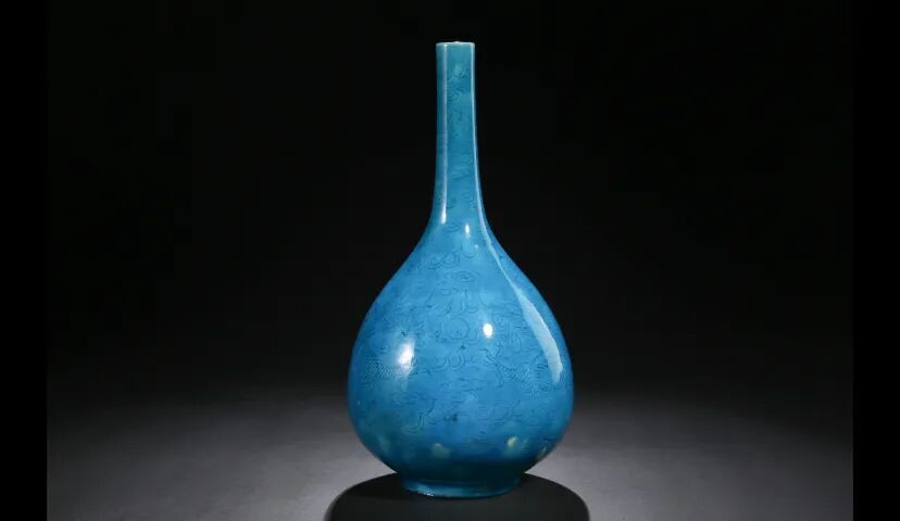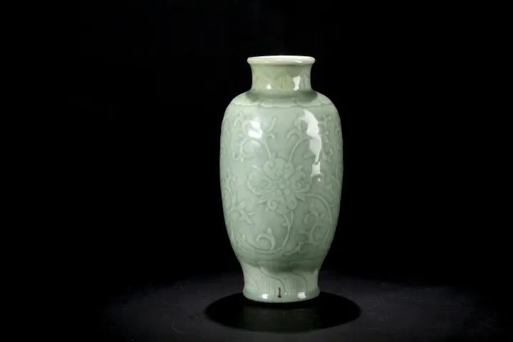 描述:此件清乾隆·青釉模印花卉纹瓶,款识:成化年制,撇口束颈,圆鼓腹,收腰撇足,窈窕挺拔。身施青釉,器身模印装饰缠枝花卉纹并刻划花瓣纹,纹饰美观。线条流畅,立体感较强,为陈设佳器。