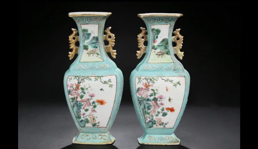 描述:此件清乾隆·珍珠绿地开窗粉彩花卉纹壁瓶一对,壁瓶为半剖瓶型,侈口,束颈,丰肩,敛腹,足微外撇,两侧置耳,器型挺拔,制作精巧。外壁以珍珠绿彩铺底,颈腹各设方形开窗,内绘粉彩山水纹和花卉纹,色彩丰富,成对难得,适宜观赏。