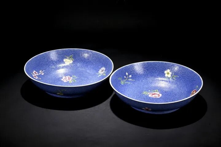 名称:清光绪·蓝地轧道粉彩十二季折枝花卉纹盘一对