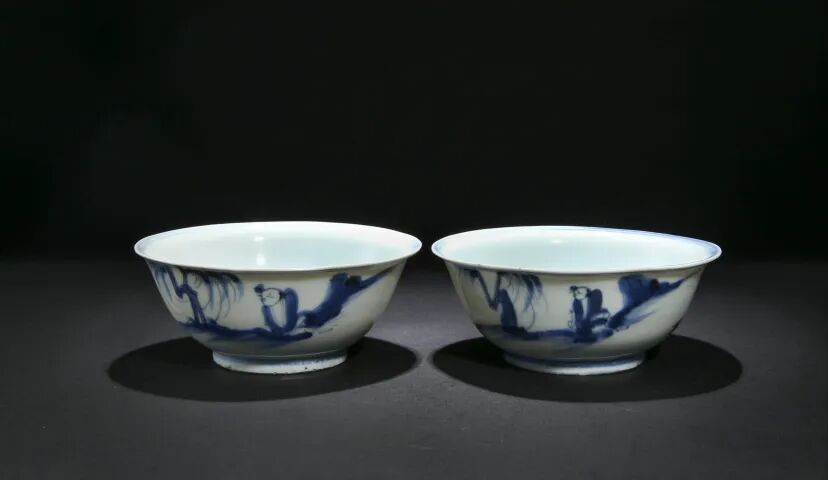 描述:此件明万历·青花山水人物纹碗一对,撇口,深弧腹,下承圈足,施白釉为地,釉面莹洁净雅,碗心及外腹得青花之法绘山水人物纹。青花浓淡相间,青翠蓝郁,皴染随性自然,工笔纤巧秀丽,挥洒自如,画风极为写意,一派闲雅清幽意境。