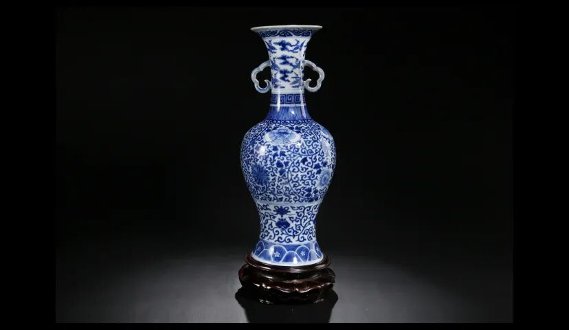 描述:此件清晚·青花缠枝花卉云鹤纹双耳瓶,撇口细长颈,两侧置如意耳,鼓腹收腰,胫足外撇,形制独特,窈窕俊美。身施白釉,器身以多层纹饰规整排布,颈腹主绘云鹤纹和缠枝花卉纹,胫部装饰缠枝如意杂宝纹,各处另以回纹、海水纹等纹饰相衬,颈部落“大明万历年制”款。