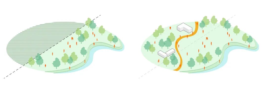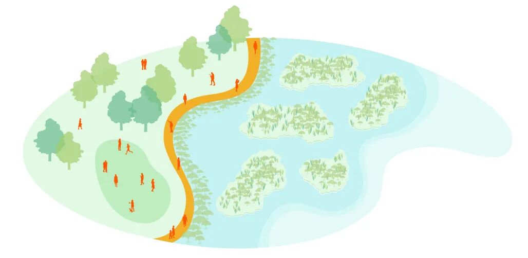 同时,通过恢复湿地岛屿等手段,我们将修复水生植物群落,延长水力停留时间,提升水体自净能力,创造丰富的生境和结构完善的生物能量网络,实现功能性景观等设计策略。