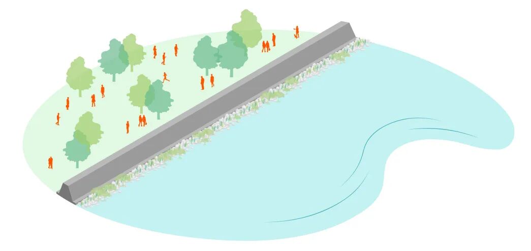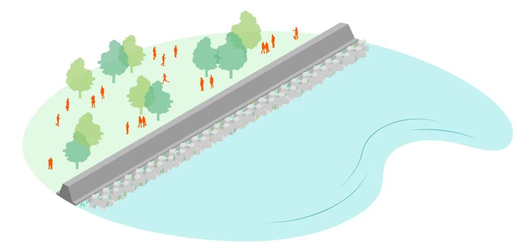 我们通过生态工法柔化水陆边界,同时营造多样化的滨海岸线,使韧性海岸实现50%的削峰率,更从容地应对风暴潮。