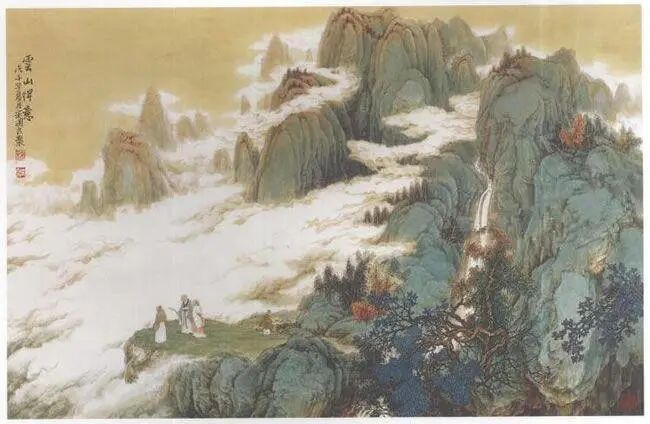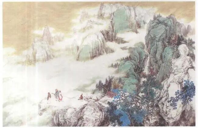 步骤四:继续层层加重色彩。山峰顶部可用苔点施朱砂、朱fi票在结构处。山腰部杂树吋选择部位用暖色过渡以活跃画面。白云用色注意冷暖变化。山坡人物处用色以冷中带暖以突出人物,衔接冷暖关系,用色过渡要自然。整幅收拾,至满意后落款、盖印,作品即完成。该幅作品山峰暖色处用粉调整色彩略腻,为不足之处。一幅好的青绿山水画,用色之道应是:轻薄处不躁,厚重处不腻为佳,其关键在用墨要恰到好处。