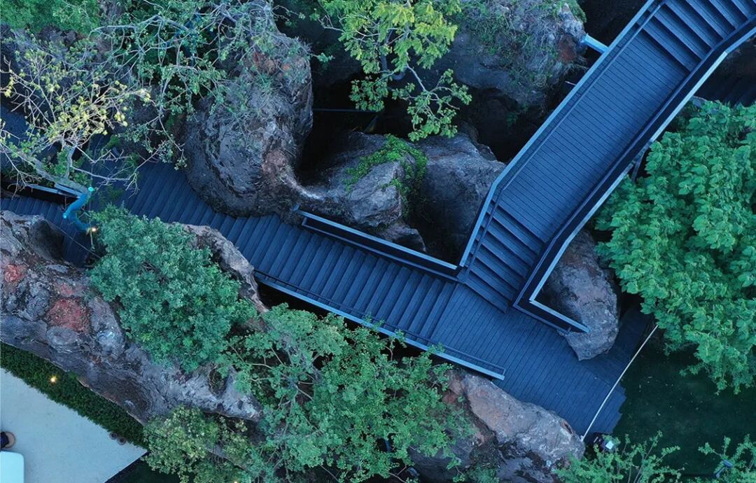 而在项目半山石林中,我们走了一条“从来没有人走过的路”,脚下是悬崖,步步惊心,但抬头即可看见天空远山。我们走了能走的路,又开阔出曾经不能走的路,安逸、野趣其实是一回事。