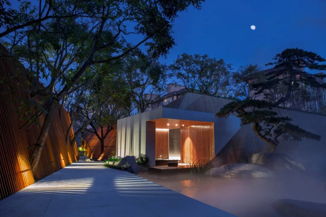 丘园藏山项目,主一个“藏”。而藏是最好的“露”,也是这个园子的性情。8字院里藏了一座山,院外门庭宽展,门小堂大,入园宽堂见山。后山悬差藏瀑,池底空透,望下去,流光下还藏着一座水光透天的房子。