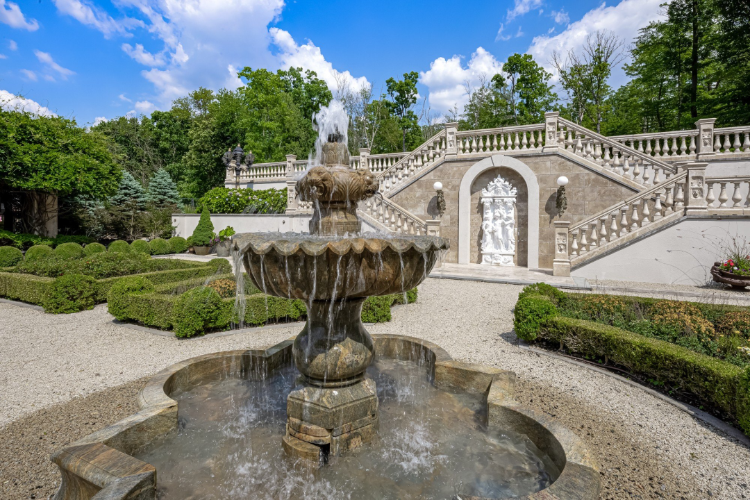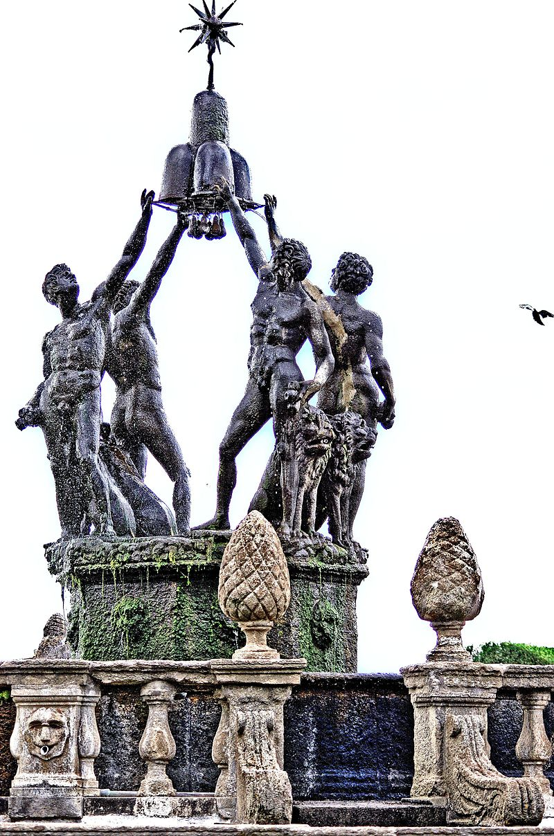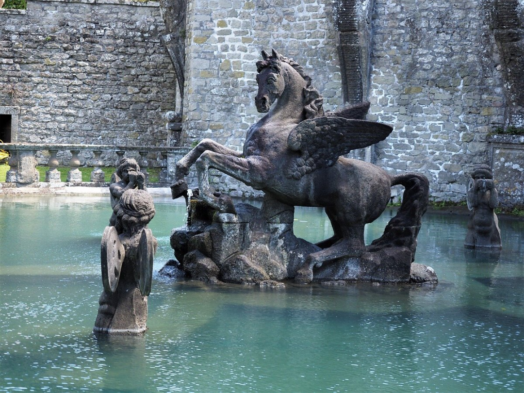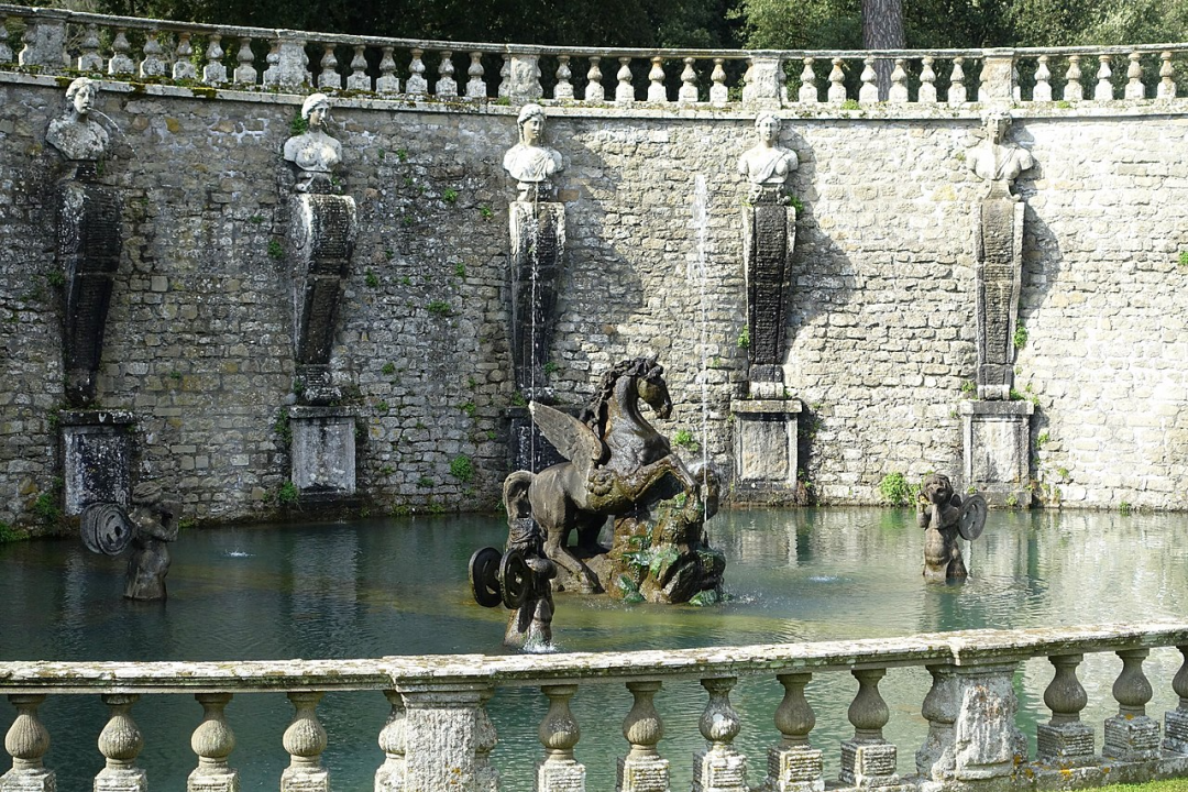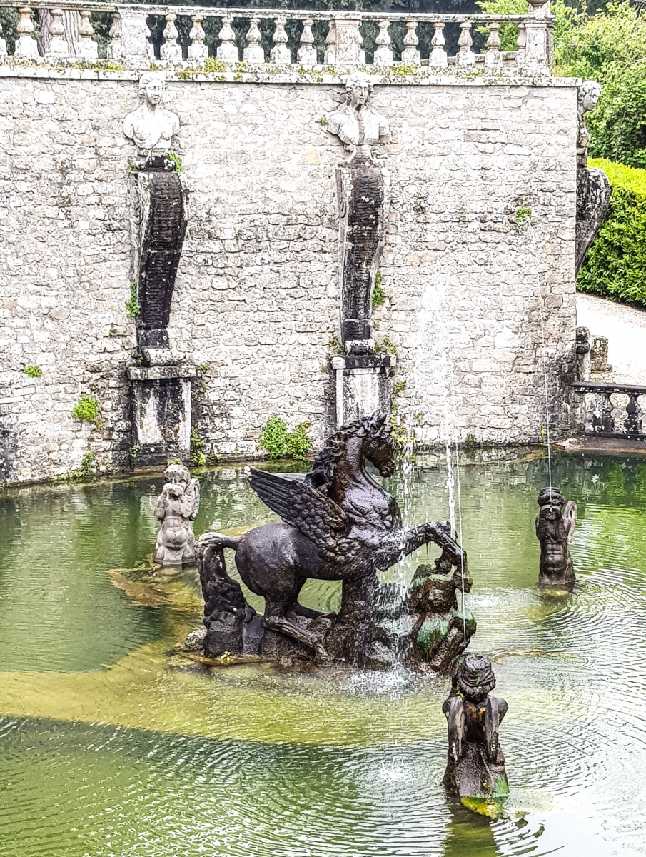 首先我们来到的是庄园右手边的飞马喷泉,一匹健壮的飞马正在用蹄子敲打脚下的土地,旁边是四个丘比特,后侧的围墙上则有九位缪斯女神的半身像。