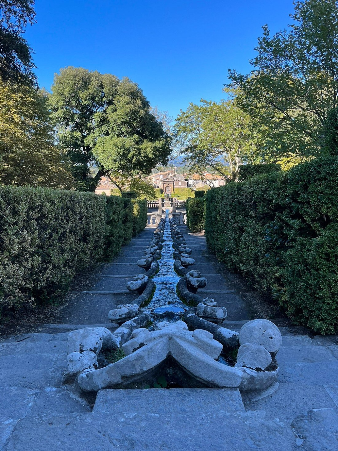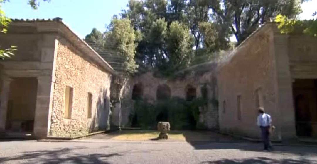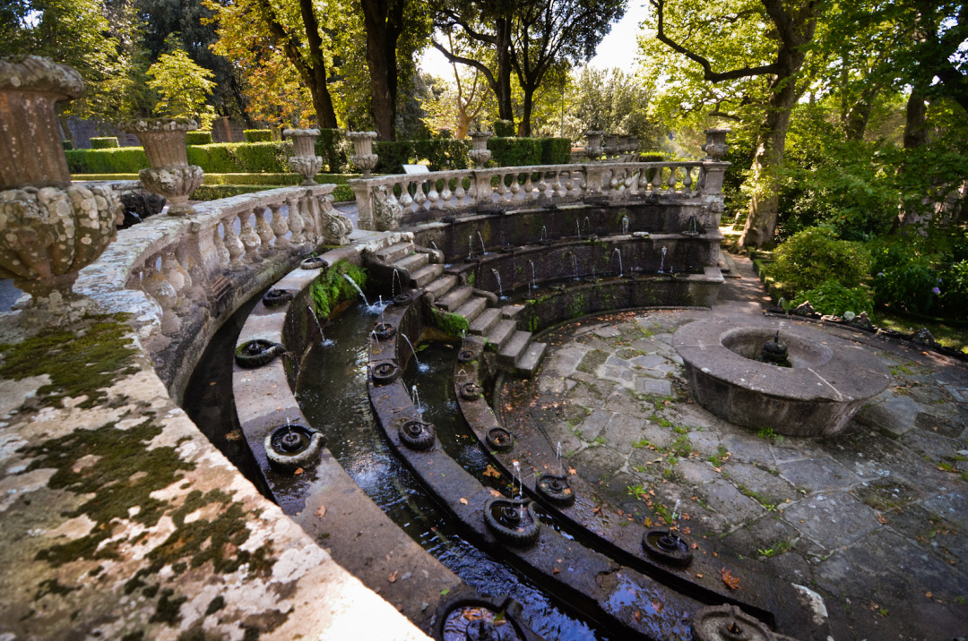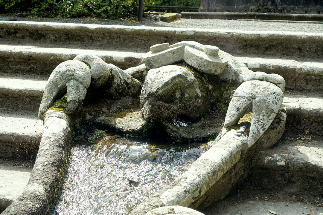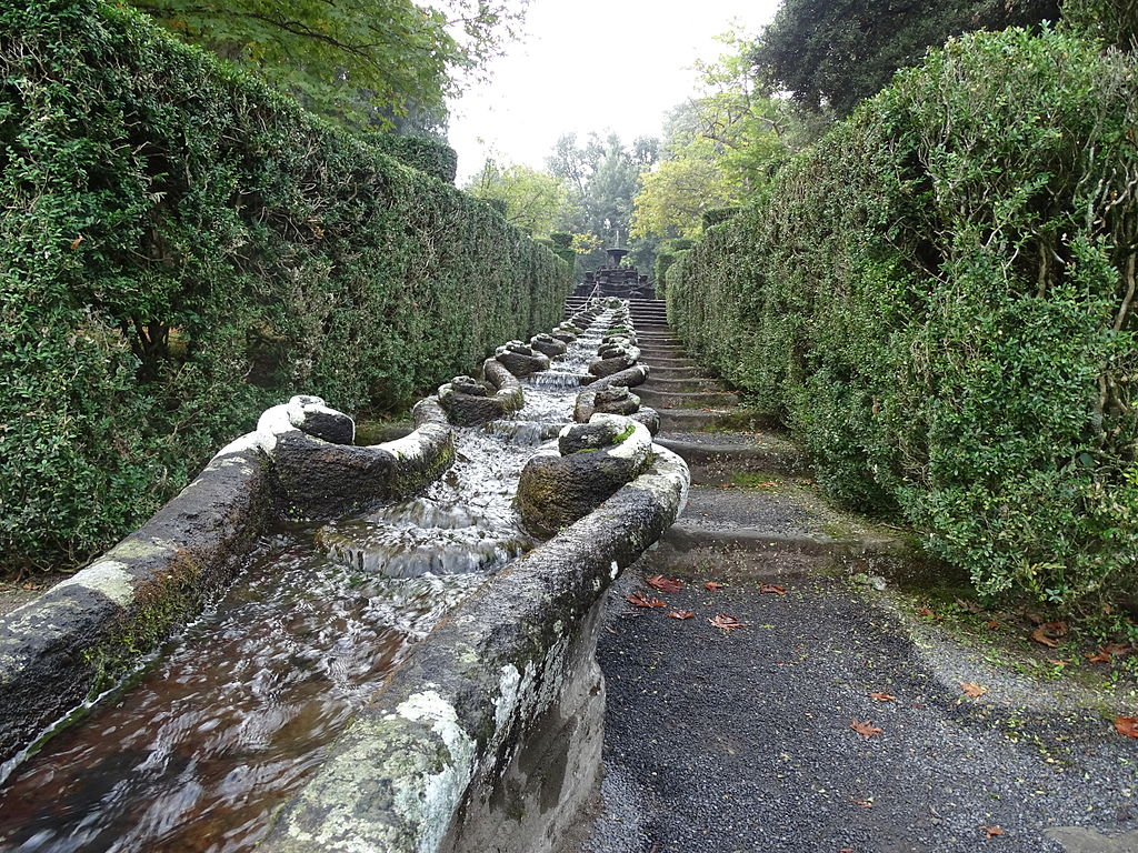 别着急,这里是一个典型的水剧场,如果你想近距离观赏岩洞踏入了这篇凹形区域,两侧屋檐上暗藏的管道就开始朝中间喷水,模仿滔天的洪水,这也叫做Giochi D`aque,翻译过来大概是“水把戏”。但这个洪水剧场一般不开放,我只在纪录片《世界八十园林》中找到了样子。