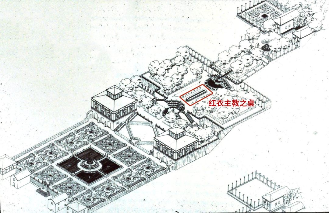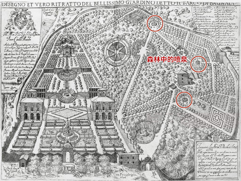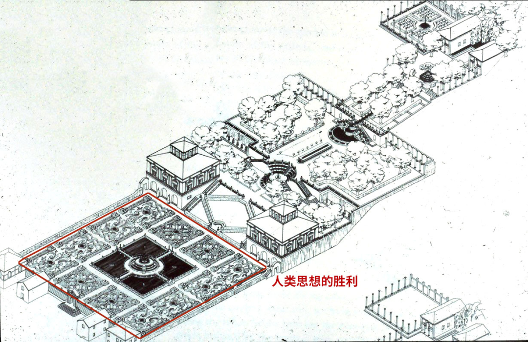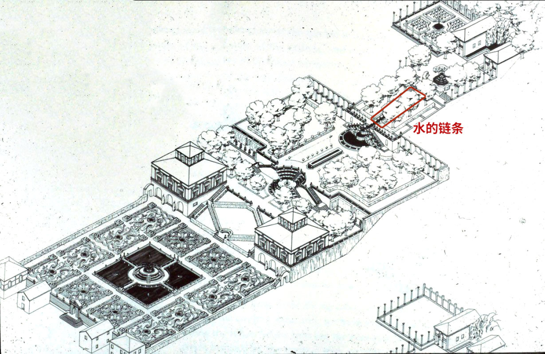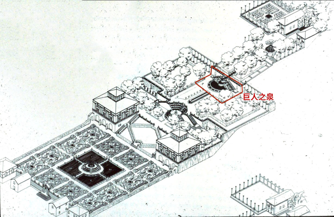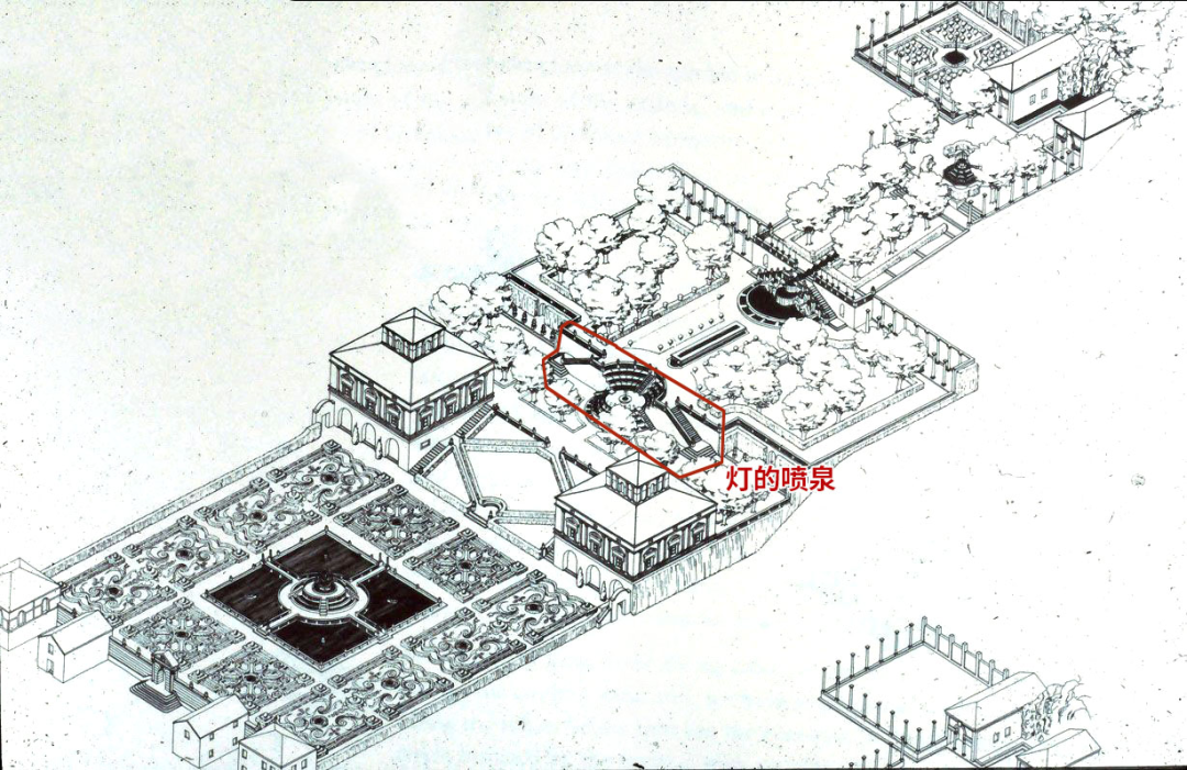 灯喷泉所在的第三层台地是一个过渡空间,站在这里我们就可以俯瞰整个花园的核心区域。