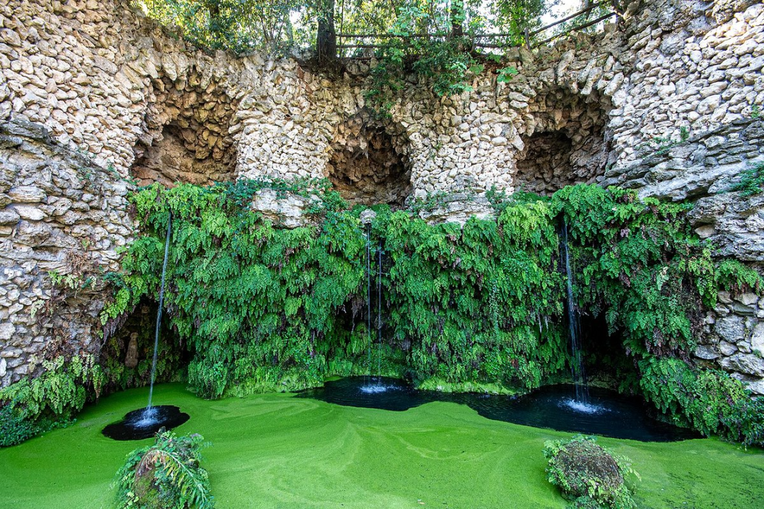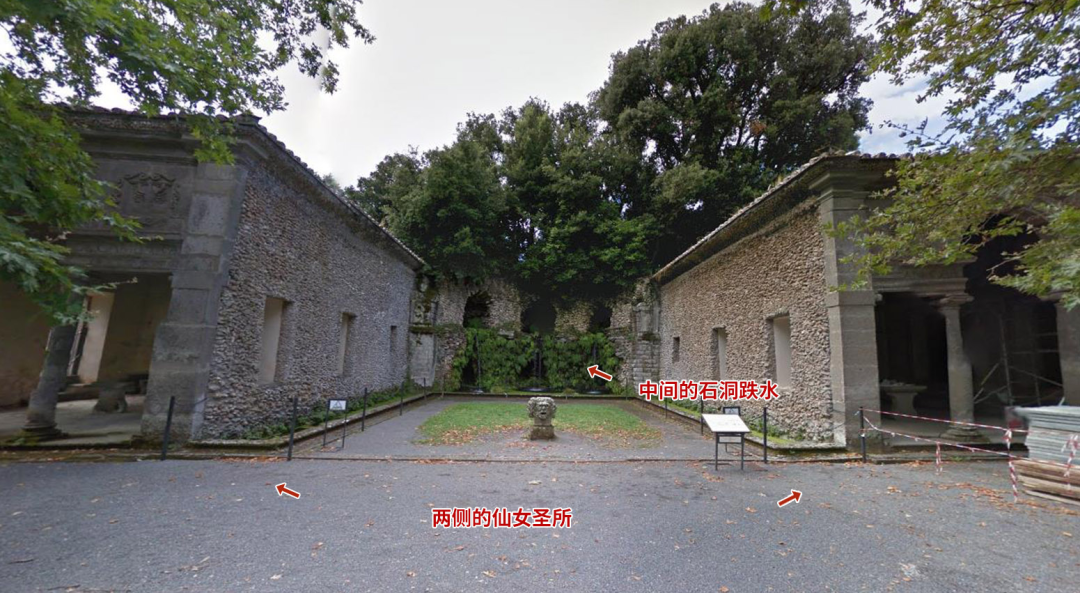 这是一个凹形空间,中间有三个岩洞流出水落入一个苔藓池塘,而两侧是两个凉亭象征在洪水中保存人类火种的Mount Parnassus山峰,也因为凉亭中有纽斯女神的塑像而象征了水中仙女的圣所。