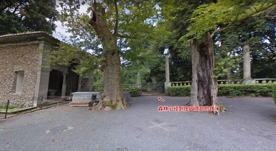 我们来到树木繁茂的山坡上,在庄园顶端右侧有一扇小铁门,从这里可以进入花园的最高处,而我们的旅程才会正式开始。