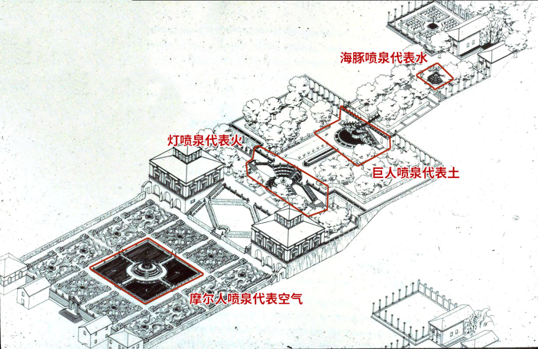 四个矮人在四周的方格池中,也是水机关,可以朝人喷水。