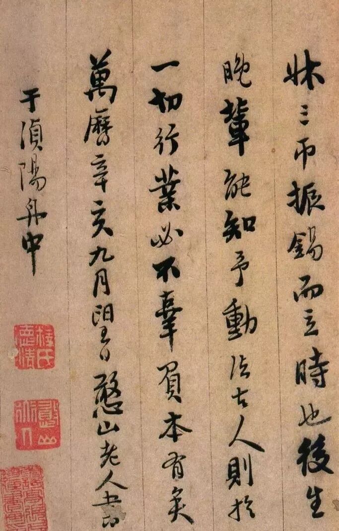 从其取法的角度看,憨山悟性极高,有聪慧之气,所以他的作品前人的影子不多,自己的个性不少,有时还善于在个别点画中以隶意出之,这在妍美的风格上掺和进了一点古拙的意味。
