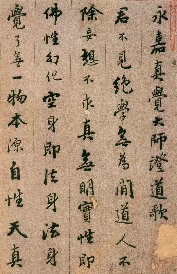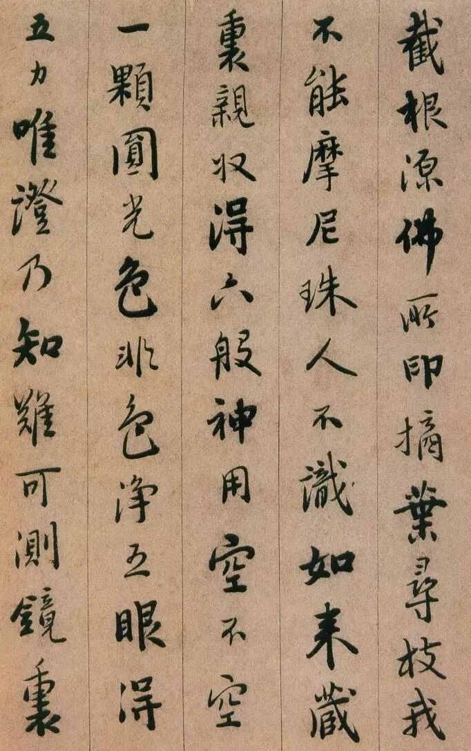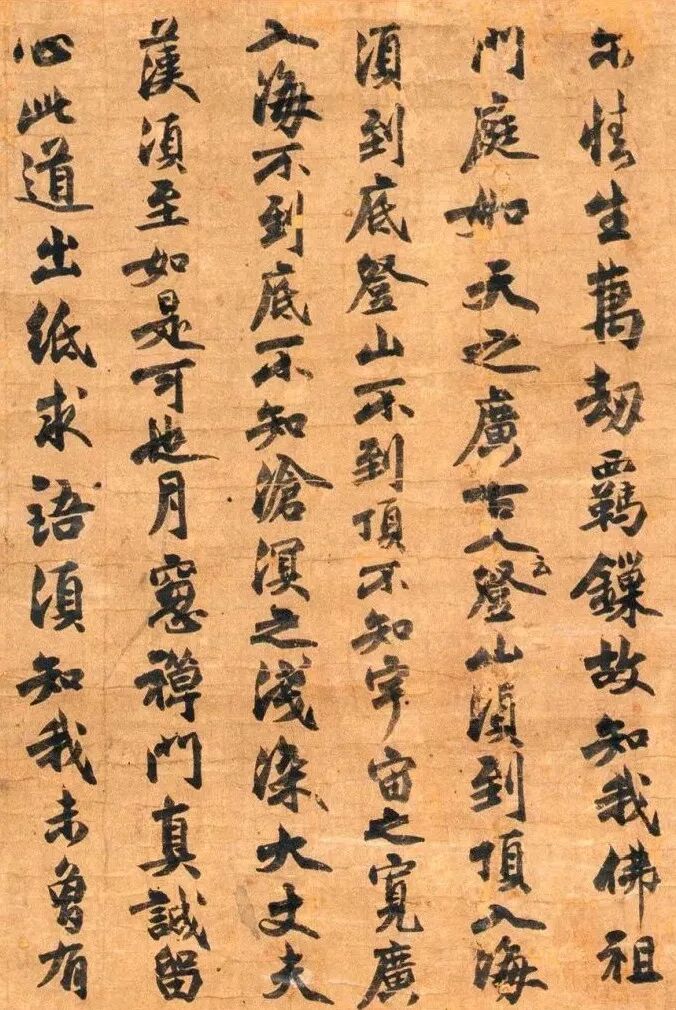 憨山《永嘉真觉大师证道歌》,此本内容为性理修养之说,涉佛教。写法上本于王字,不少字的结字与《圣教》相类。然取势用笔颇有自己特色,与明末书家喜一笔顺势带下,连绵不断的行草写法迥然有别。总体的特点是静穆而不乏灵动,端稳而不乏妍美。