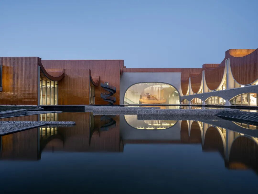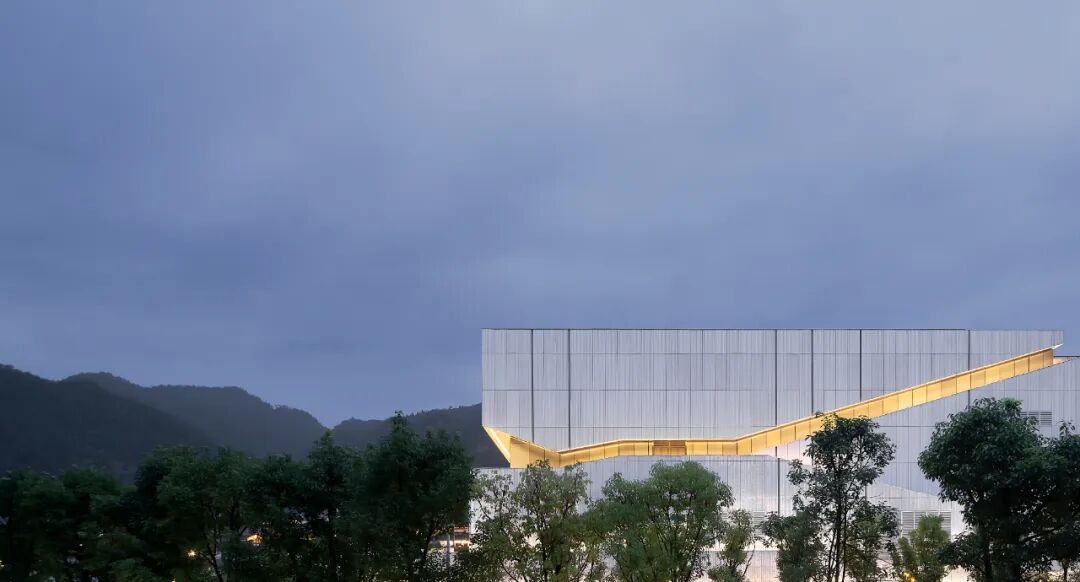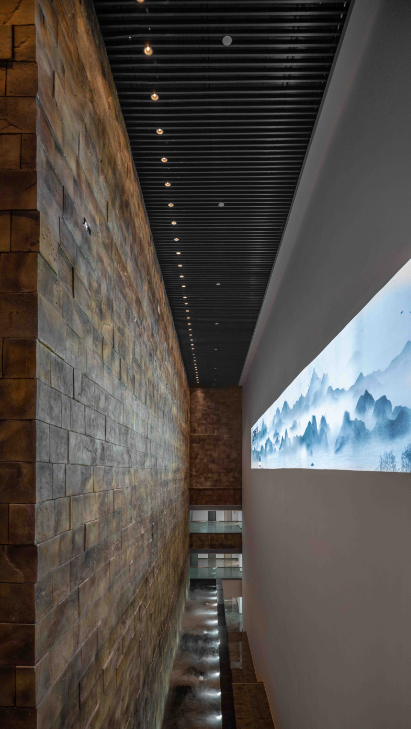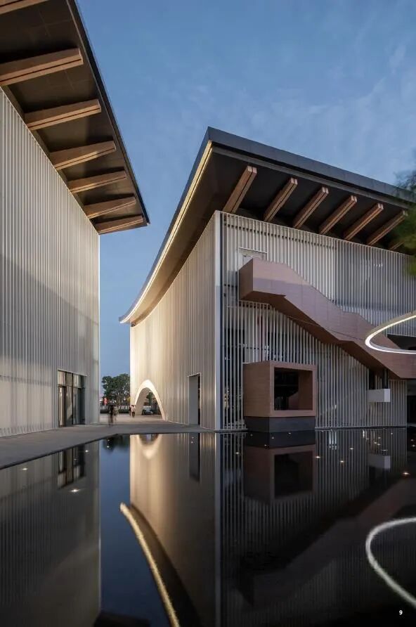 10个展厅均采用实体外墙,但玻璃幕墙的窄巷空间可以让观众自由穿梭其中,一虚一实的组合使建筑别具魅力,建筑融入湖光山色,迷人的景致又被镶嵌进建筑中。
