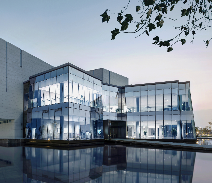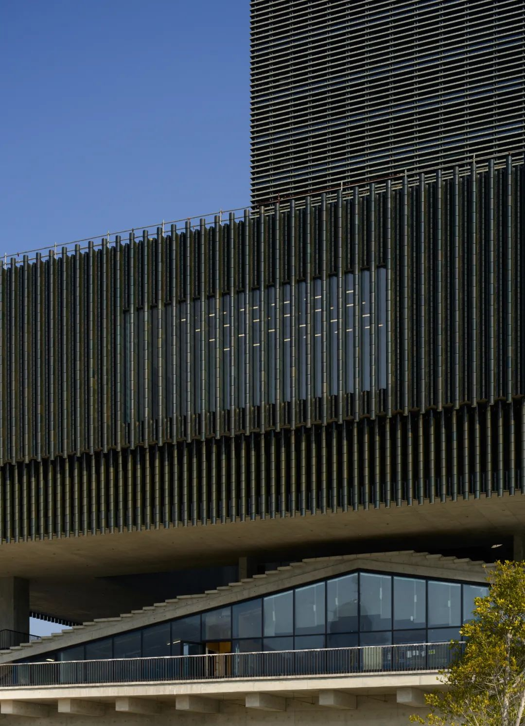 建筑的结构很简单,水平的底座上矗立着一座纵向大楼,看起来就像一个倒写的T,只有一横和一竖。设计看似貌不惊人却别出心裁,陶瓦材料外饰,赋予了建筑更丰富的层次感,也是在向中国传统文化致敬。陶瓦作为建筑的保护层,可以抵御高温、湿度、风力侵蚀的影响,耐用且美观,它们还会根据天气和时间不断变化颜色,形成深浅不一、无限延伸的墨绿色波浪,远远望去就像一片竹林。