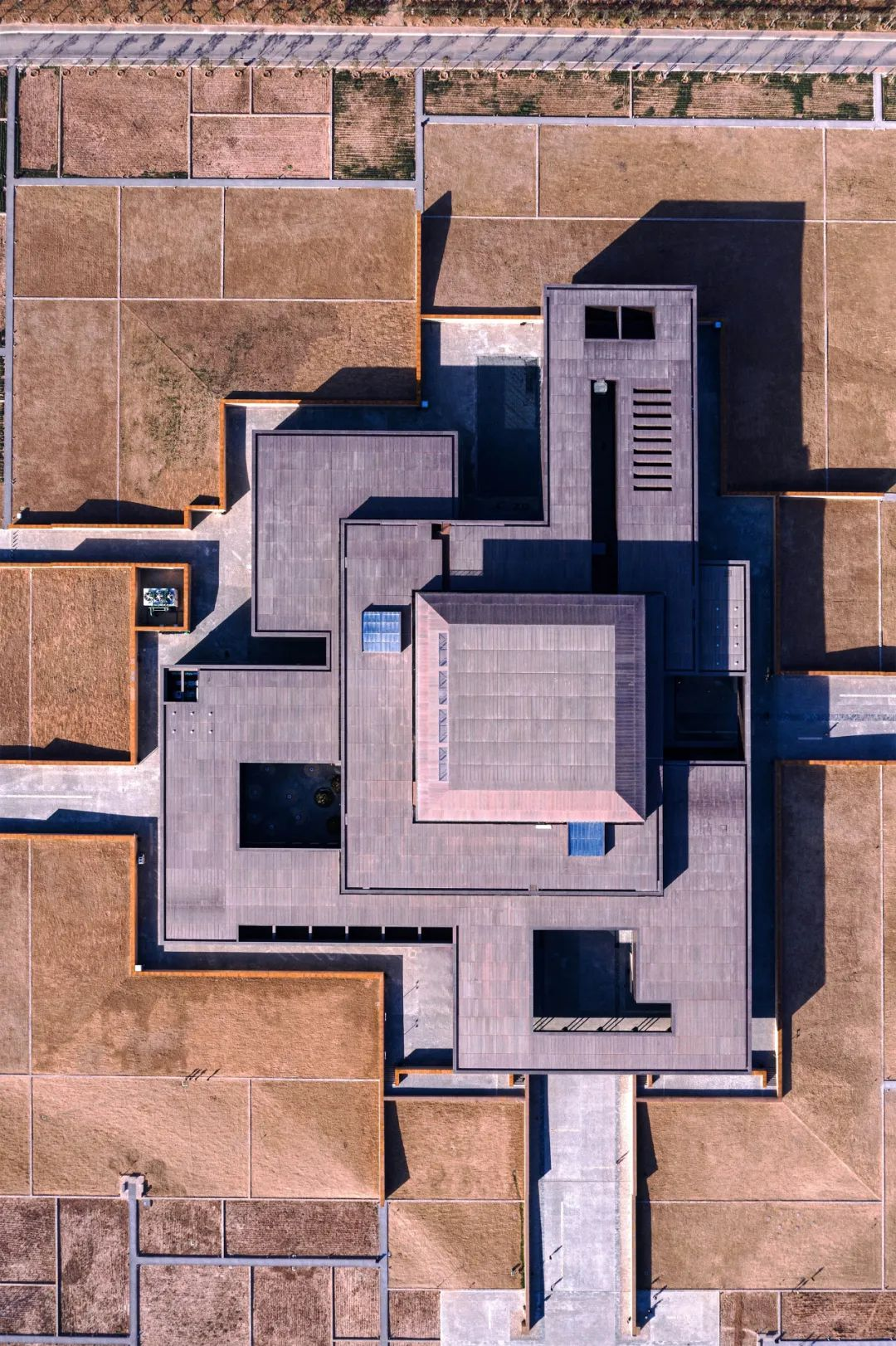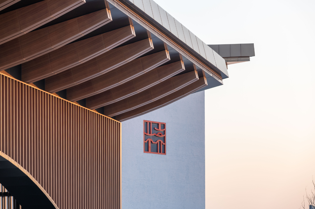 规整的展馆建筑有着不规则的延伸状态,取材自遗址中的城市干道,铜板幕墙、手工夯土、清水混凝土的现代化处理,放在古朴的遗址周围,也不显突兀。以低调消隐的姿态尊重郊野大遗址的原生状态,从而营造旷远幽邃、访古探源的特殊场地氛围,是建筑的基本设想。