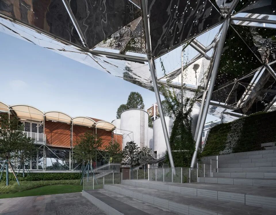 建筑外形上宽下窄,形似中国古代器皿,整体工业风偏重一些,也融合了一些香港本土元素。建筑整体倾斜的结构,让声音可以环绕,空气流动也比较好,对于保存藏品十分有利。