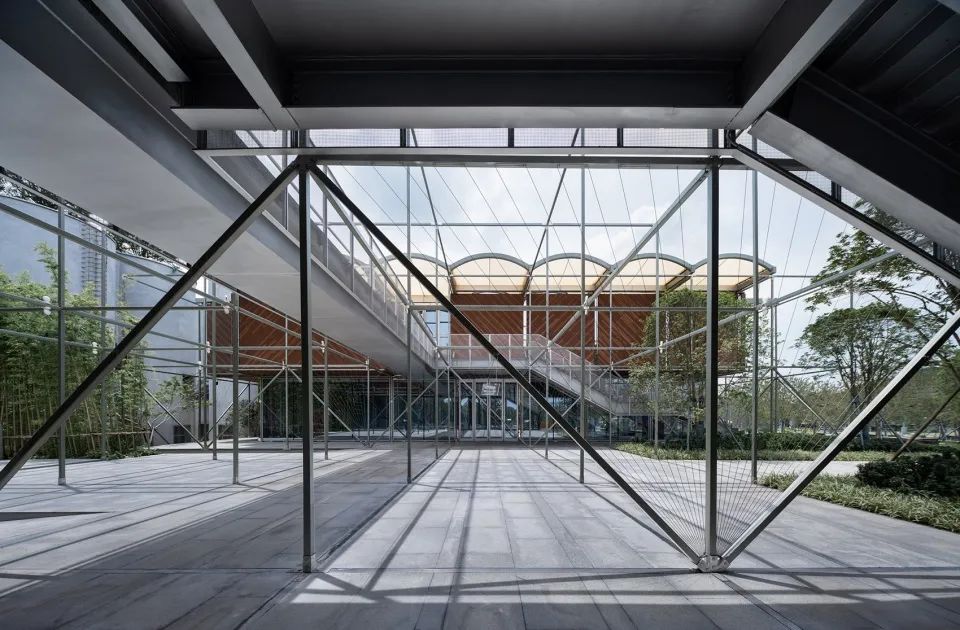建筑的结构很简单,水平的底座上矗立着一座纵向大楼,看起来就像一个倒写的T,只有一横和一竖。设计看似貌不惊人却别出心裁,陶瓦材料外饰,赋予了建筑更丰富的层次感,也是在向中国传统文化致敬。陶瓦作为建筑的保护层,可以抵御高温、湿度、风力侵蚀的影响,耐用且美观,它们还会根据天气和时间不断变化颜色,形成深浅不一、无限延伸的墨绿色波浪,远远望去就像一片竹林。