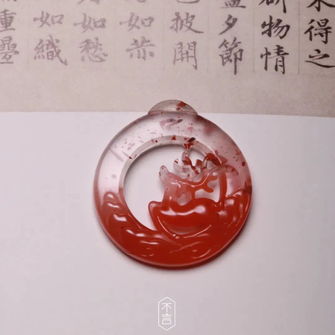 因为地质环境不同,南红的品类也是很多。比如有一种南红,它的红色飘在晶莹如冰的底子上,有的红色还形成了天然的花纹和形状,就像一幅意境优美的画。