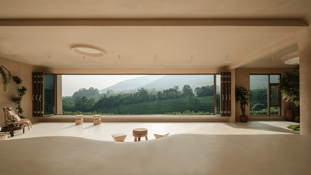 茶室最为突出的亮点之一,是面向茶园的长条形全景落地窗,占据了一整个墙面,像是一个别致的取景框。气候适宜时,横向足有12米的折叠式落地窗可以全部打开,让茶客毫无阻拦地欣赏美景,享受不时吹来清风。