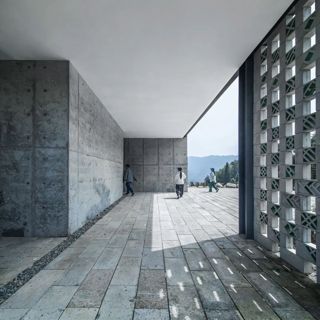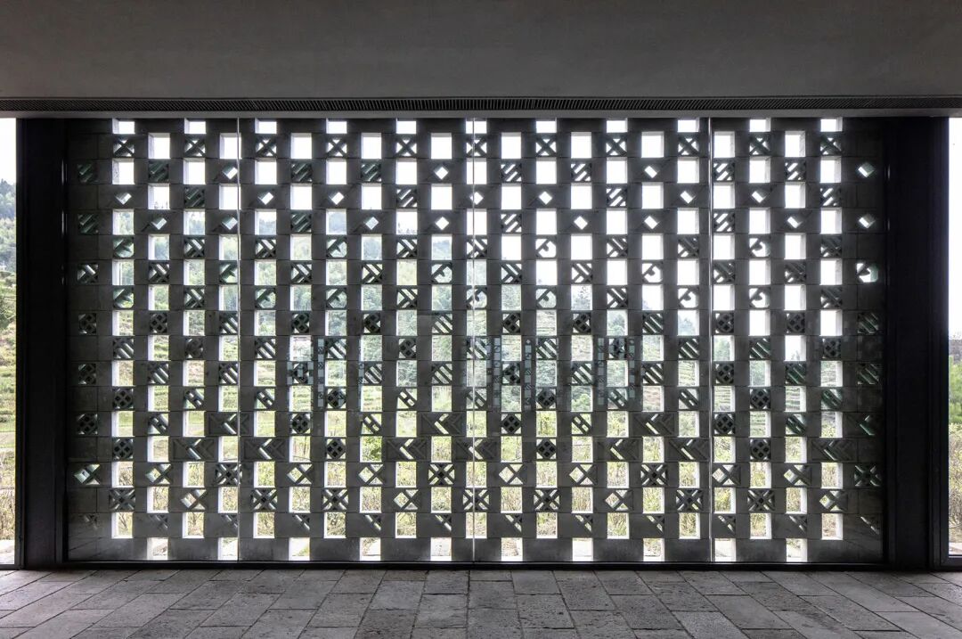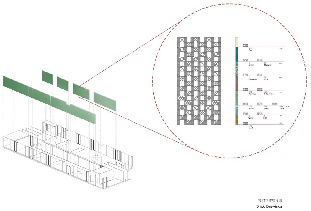 工坊和茶室的东面墙体均采用镂空砌块墙,既能为工坊防晒遮阳,又可以分隔茶室和展廊。砌块的预制图案由畲族象形文字符号图案组成,畲族在历史上曾度过漫长的狩猎生活和“刀耕火种”的年代,有本民族语言,虽没有系统的文字,但是,在长期的生产劳动中也形成了一些会意图形,可以表达简单的含意。墙面上的畲族象形文字砌块,根据符号含义沿垂直方向排列,从最下方的土地一直到上方的太阳,重构畲族山地耕猎场景,是空间的第二层文化展示内容。