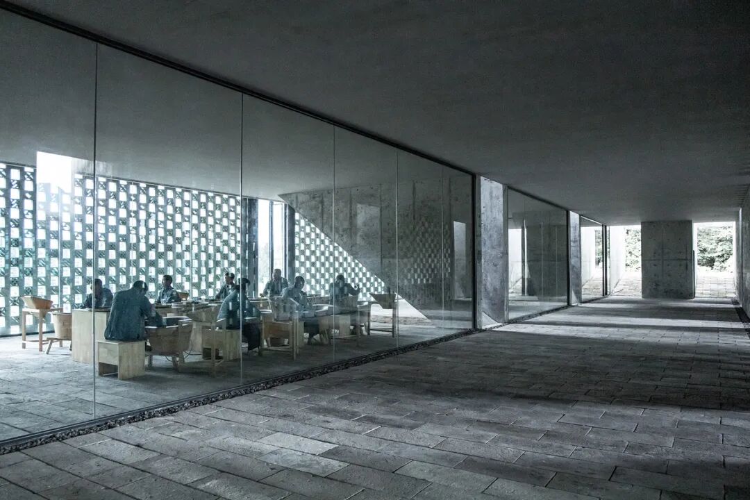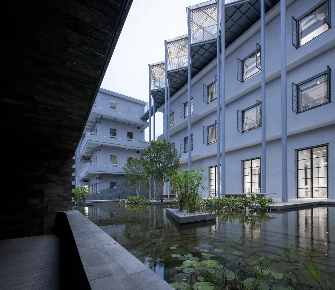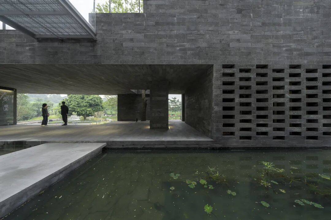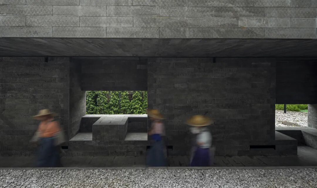 积石为台:设计在地景层面用一种产自南方的黑色花岗石(依附钢筋混凝土结构)砌筑一环绕原有厂房群落的“景台”。石砌景台具有多孔结构,重新梳理和界定内部生产和自然种植之间的关系。