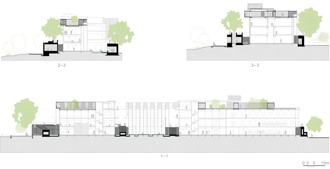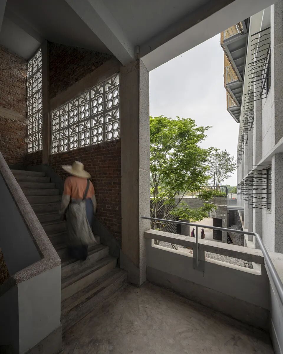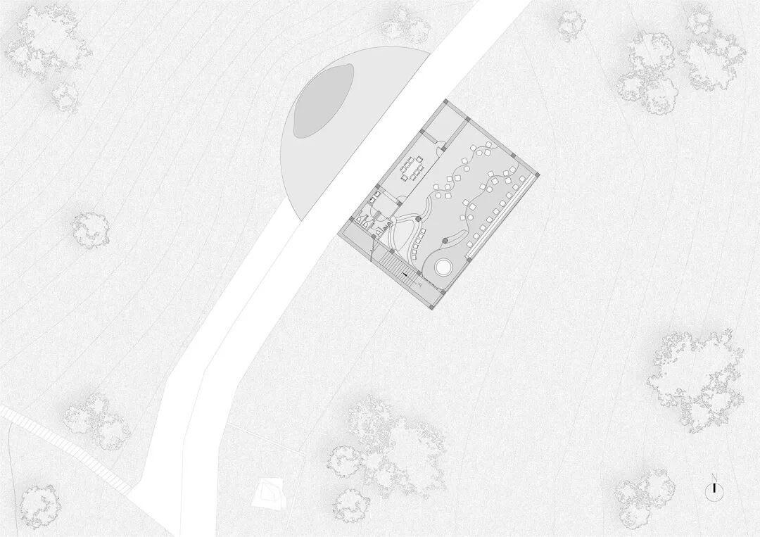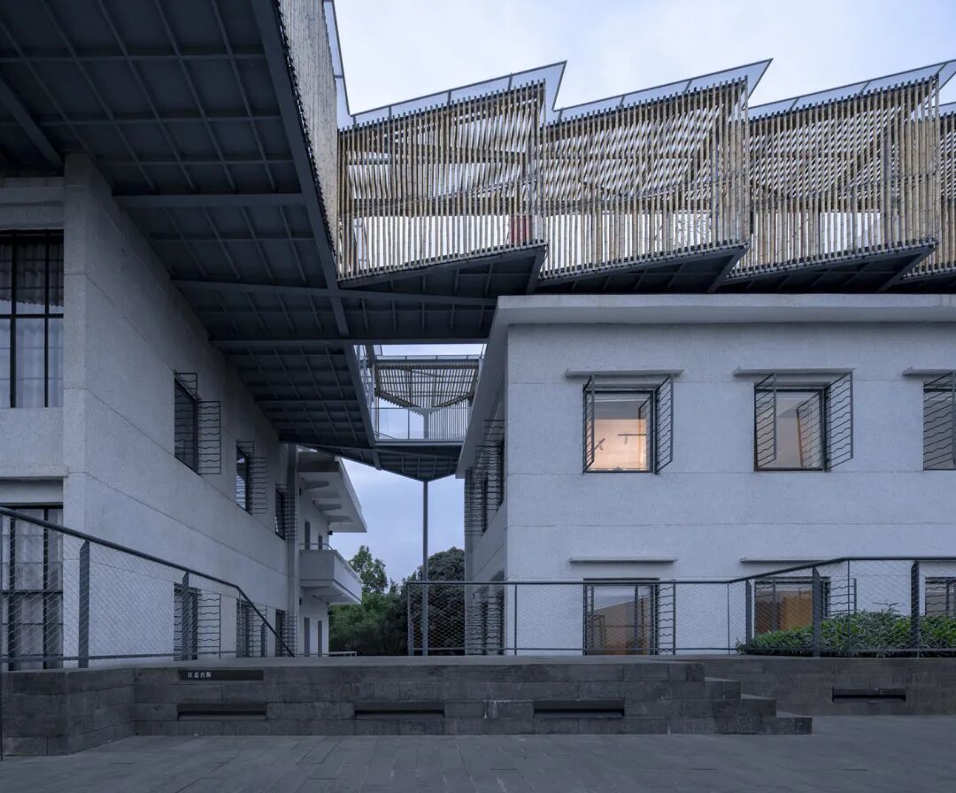 积石为台:设计在地景层面用一种产自南方的黑色花岗石(依附钢筋混凝土结构)砌筑一环绕原有厂房群落的“景台”。石砌景台具有多孔结构,重新梳理和界定内部生产和自然种植之间的关系。