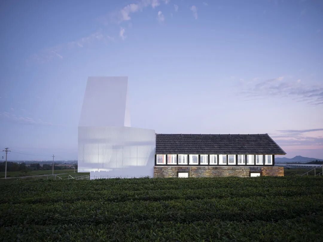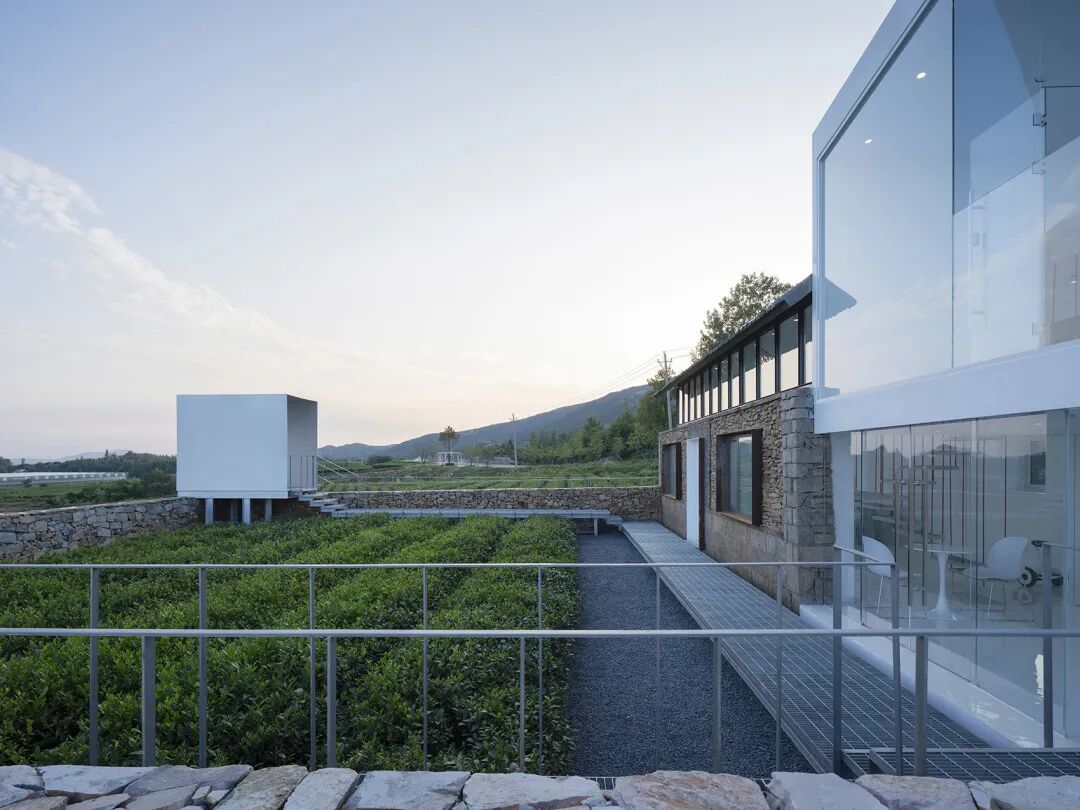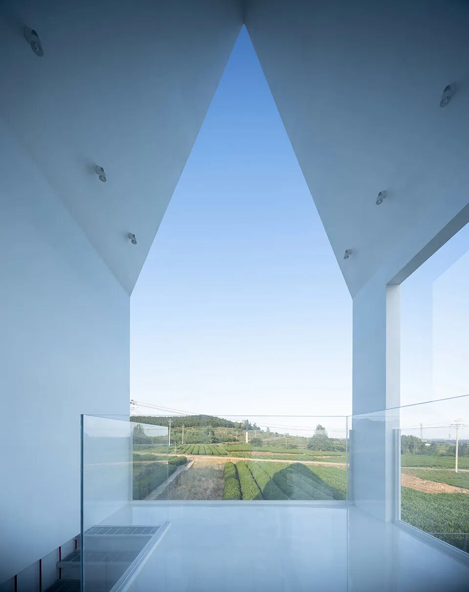 白色灯塔又一分为二,东半部分,完全开敞,面向茶田,西半部分则为一个玻璃盒子,一个可以容纳数人的小茶室。坐在灯塔建筑的一层,可以透过整块玻璃看院子里的茶田。