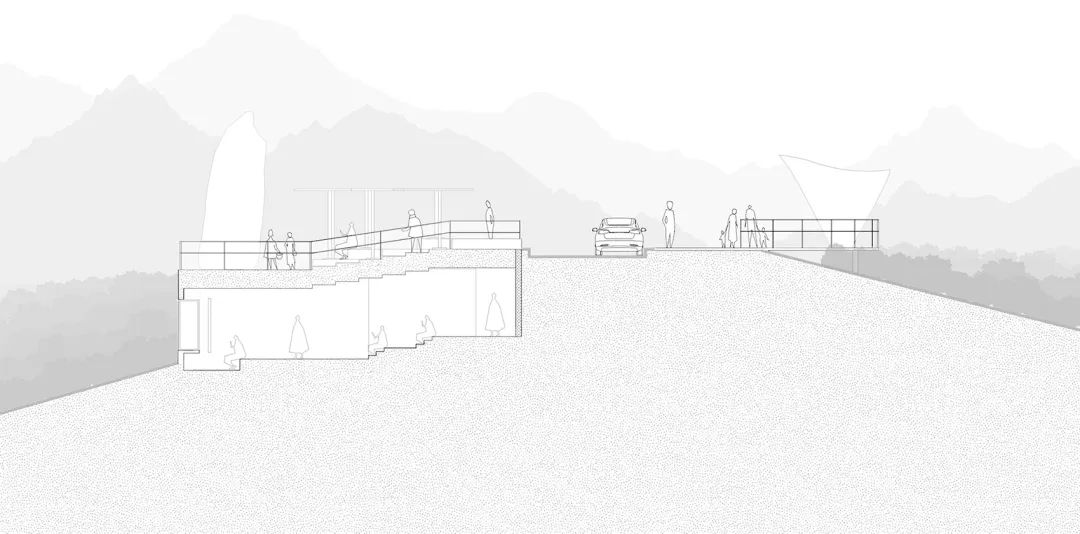 在茶室以外,还设计了两座位于茶山制高点的开放式观景平台,设计灵感源自这里的村民最引以为傲的物产——白茶。一座观景凉亭的顶棚如一瓣叶片般舒展,轻盈地落于田间。“一片叶子富了一方百姓”,承载着这片土地深厚的情感寄托。另一座凉亭的顶棚则形似漂浮的云朵,为茶农与游客提供了一隅庇荫纳凉的空间。