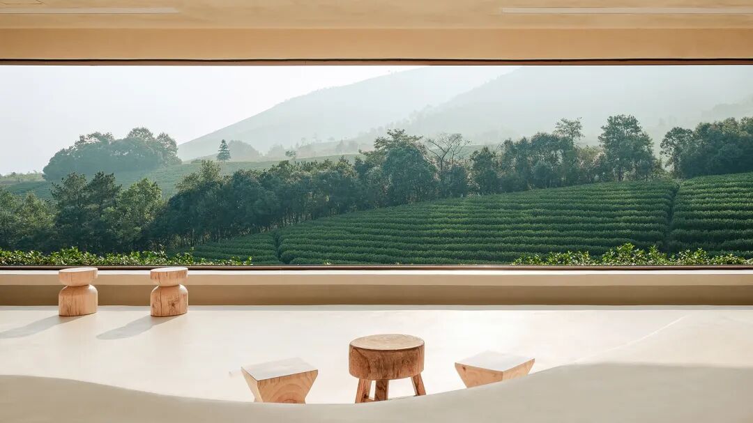 顺应茶园梯田的地理形态,采用嵌入的方法塑造出逐渐下降的茶室。在满足功能需求的同时,通过材料选择、形体塑造等方法弱化建筑的突兀感,与周遭环境融为一体。茶室内部则被打造成了大地色的“洞穴”,室内吧台、台阶的曲线如茶垄般蜿蜒,富有柔软顺滑的质感。