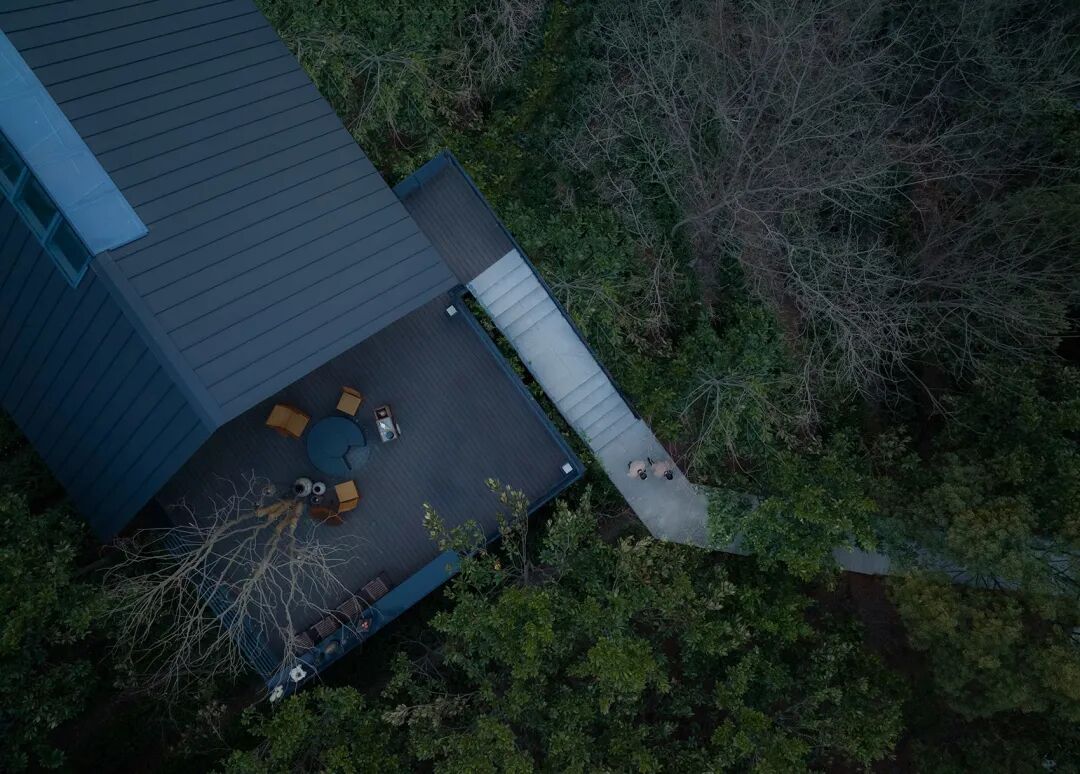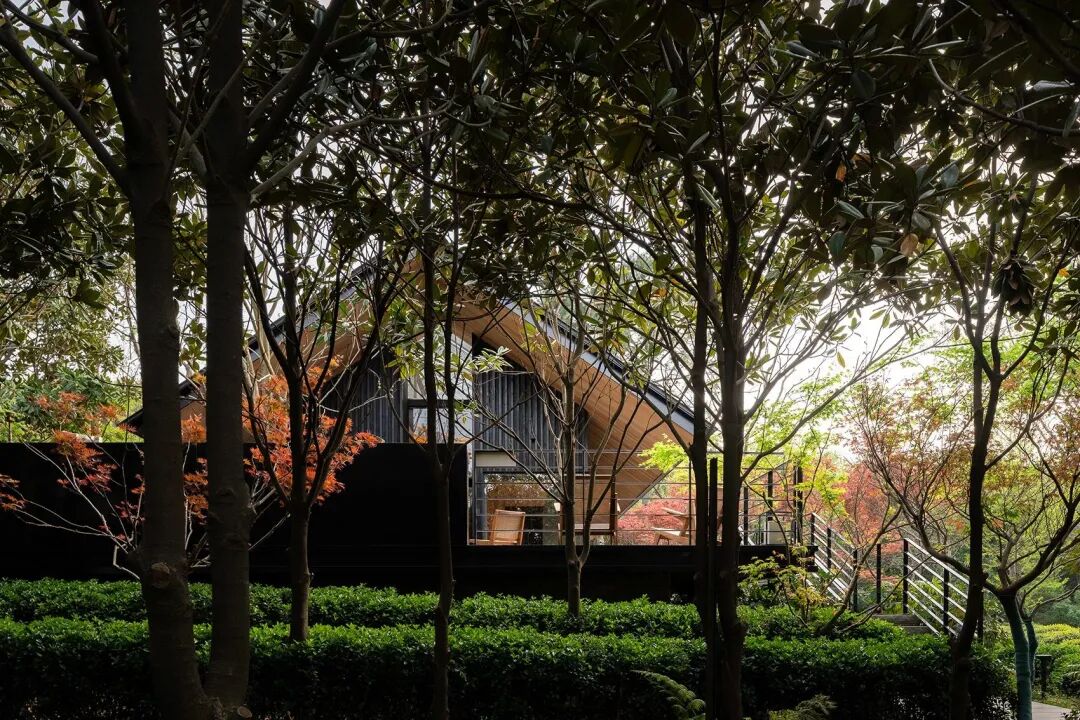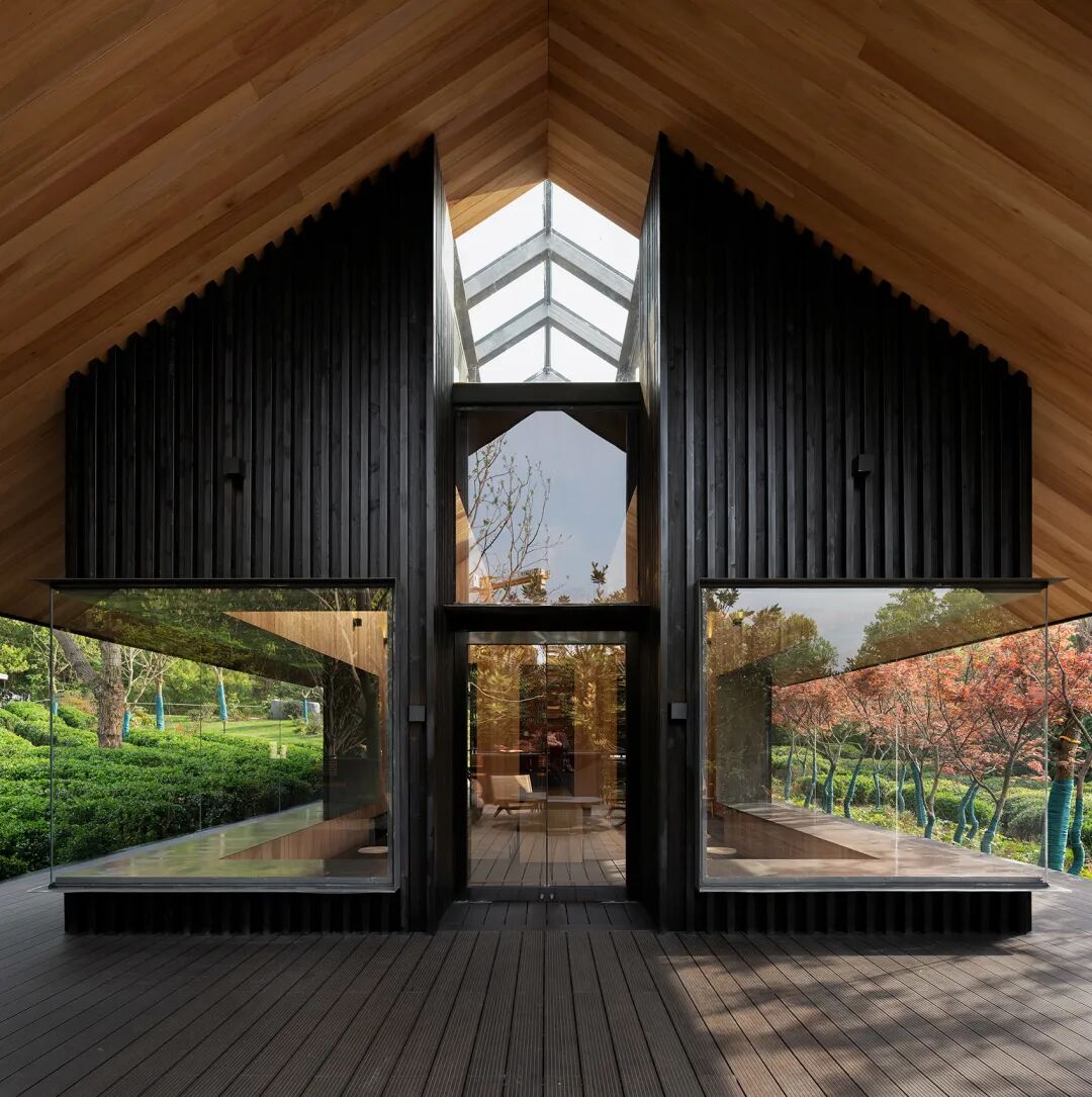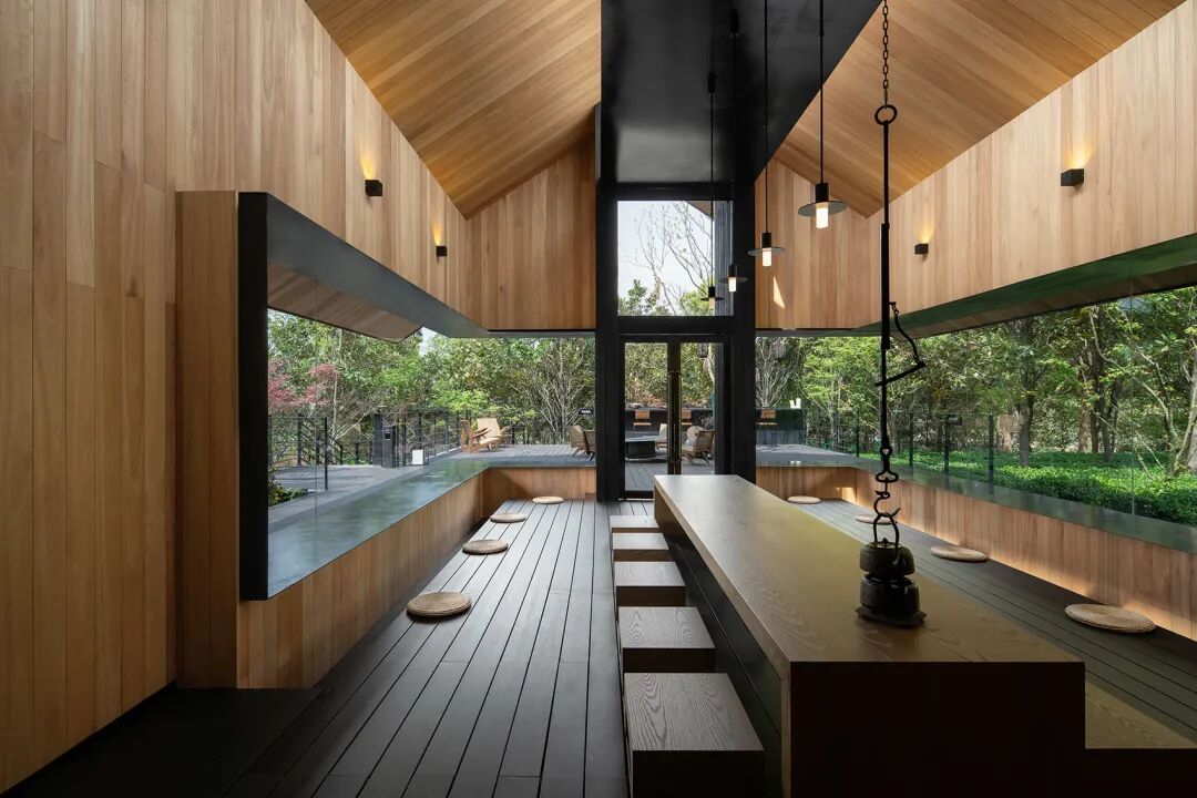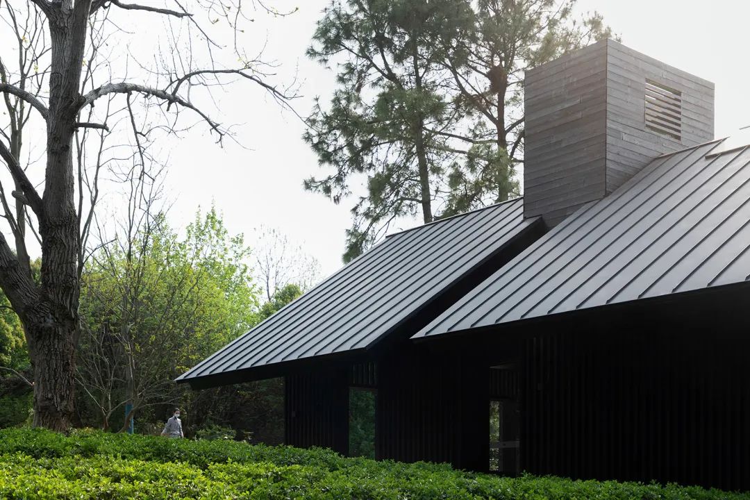 茶屋外墙采用深色碳化木面板与格栅,粗粝的肌理露出时间的痕迹,质朴且自然,与周围环境融为一体。深色的钛锌板屋面、黑色的铝板压边、黑色的钢板边框为茶屋提供了必要的精致感,颜色与碳化木相统一。整体深色的外观让茶屋多了一份内在的深沉,从容地隐于林间。