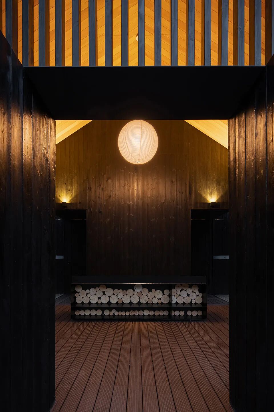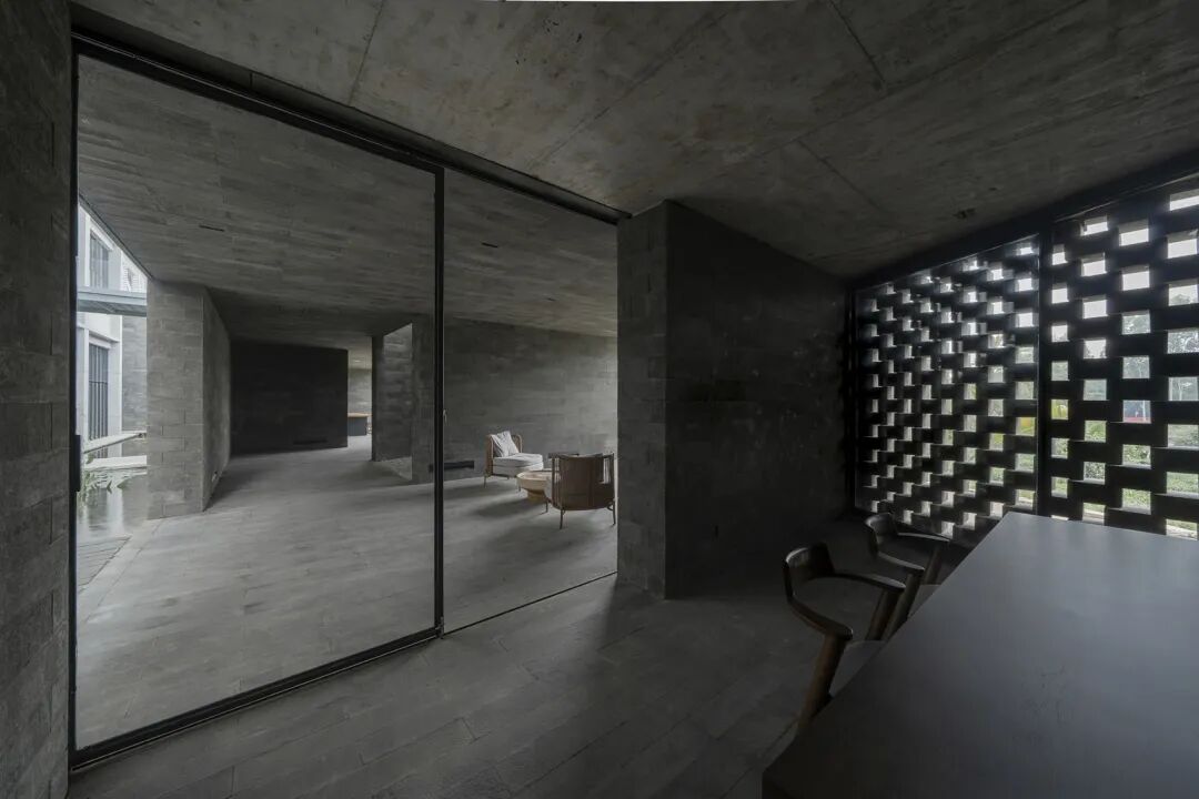 入口空间是一个半开敞的灰空间,深色的碳化木墙面弱化了光线,仿佛隔绝了外部的世界,也屏蔽了心中的杂念。人们开始沉静,照见心中的光明。经过短小的过道,一瞥落地窗引入片刻的自然,便来到主室。