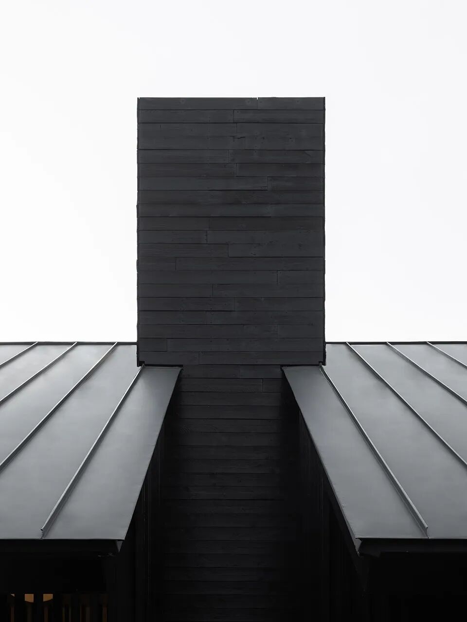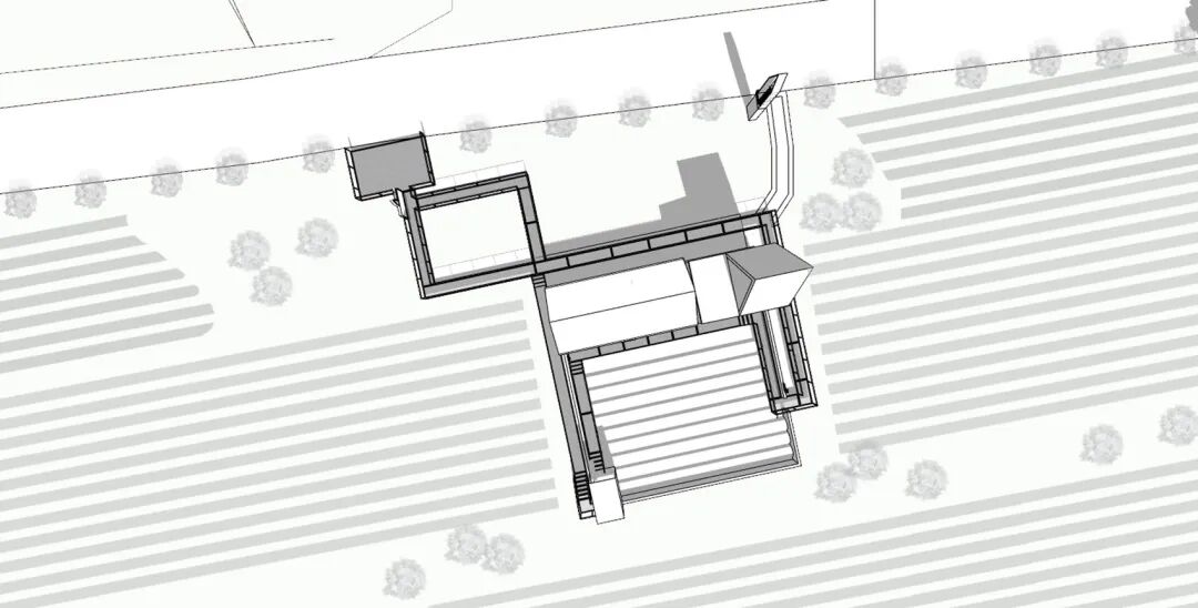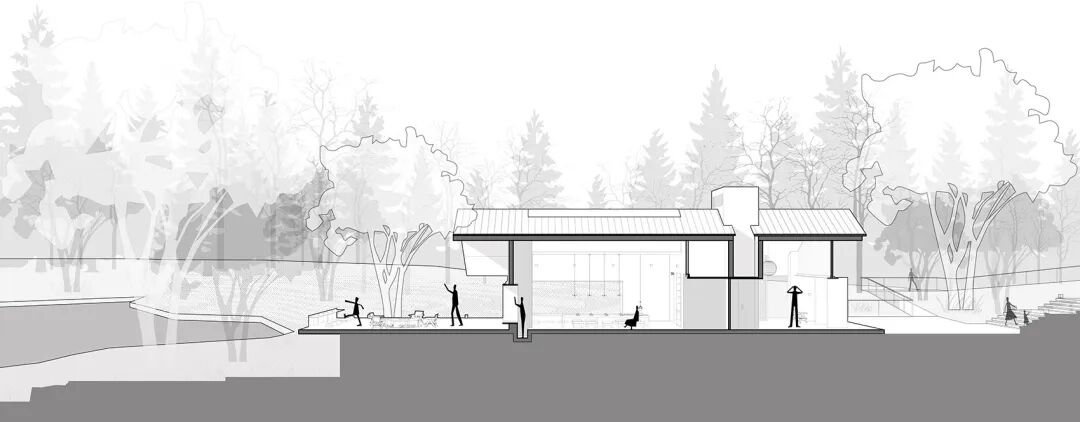 一个坐落于台的双坡顶房子,并以此原型作为“屋型”的设计概念。它坐落于一个延展的台之上,对称的双坡大挑檐向两侧铺开,仿佛漂浮于林海之舟。高耸的长方体将茶屋切割为两部分,形成相对独立的入口空间与主室空间。长方体作为服务间,顶部突出屋顶,设备藏匿于此,也隐喻着烟囱的形象。