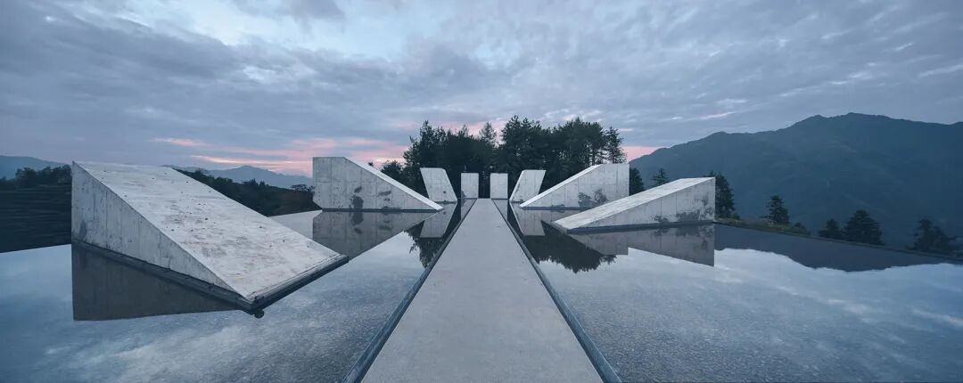 八个光筒的体量和高度,是由夏至不同时辰的光线决定的。从山上俯瞰,水面反射大自然的天光云影,建筑体量消隐不见,只有一组太阳光轨的雕塑柱体,与自然对话。