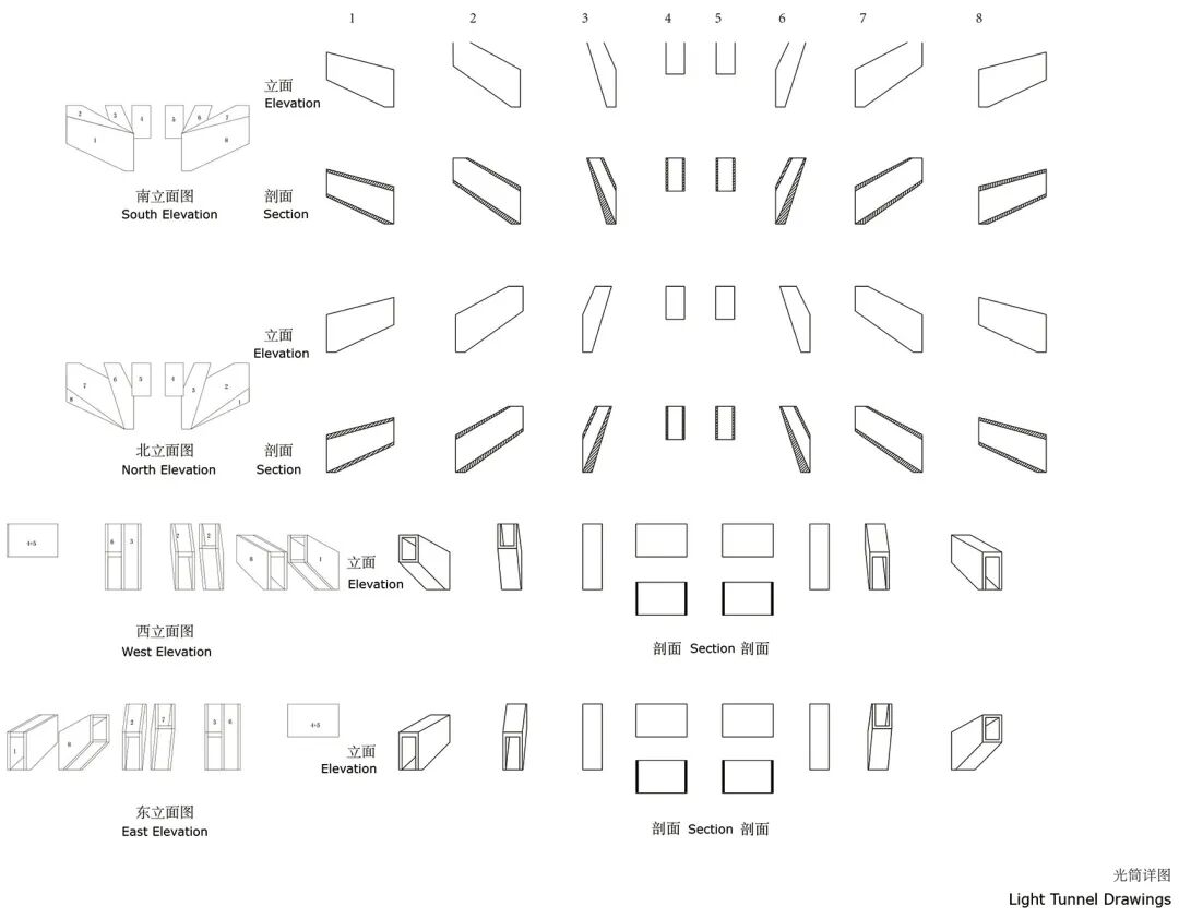 夏至,日照时间最长,太阳角度最高,也是二十四节气最早被发现的节气。光筒遵循夏至当地太阳光的轨迹,追踪光线,捕捉时间。八个光筒的角度和方位,分别根据夏至当地日出卯时到日落酉时的七个时辰的光照角度,上午的日照时辰:卯时,辰时,巳时的三个光筒从东面茶室穿插进展廊,将茶室分割为从南侧入口公共茶室到北侧独立小茶室等四个品茶区间。