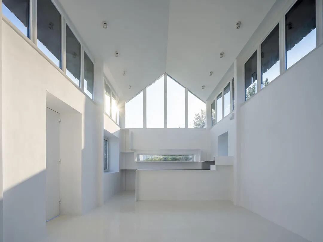 室内通体白色,原先低矮阴暗的房子变得光线充足。吧台设置在紧邻西墙的地方,通体为简洁的白色钢板,其中,一个窄长的窗户嵌入到吧台的西墙内,可以看到墙外入园的人们的身影。