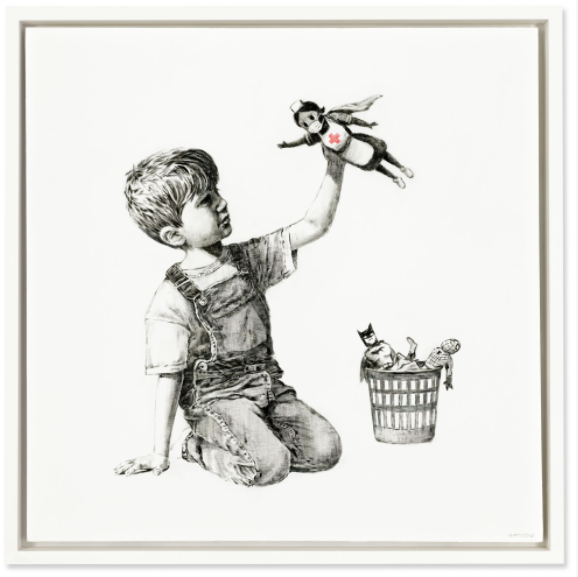 回顾 2021 年全球拍卖市场中那些成绩傲人的西方作品,数字艺术家Beeple的《Everydays: The first 5000 Days》(2021)作为第一个公开竞拍的NFT作品,于去年 3 月在佳士得拍卖场以 6934.6 万美元的成交价惊艳四座;在同一时期的同一拍卖行,英国涂鸦艺术传奇Banksy的《Game Changer》(2020)以 1670 万英镑(约 2180 万美元)的价格成交,远远超出了其 250 万~ 350 万英镑的售前估价。