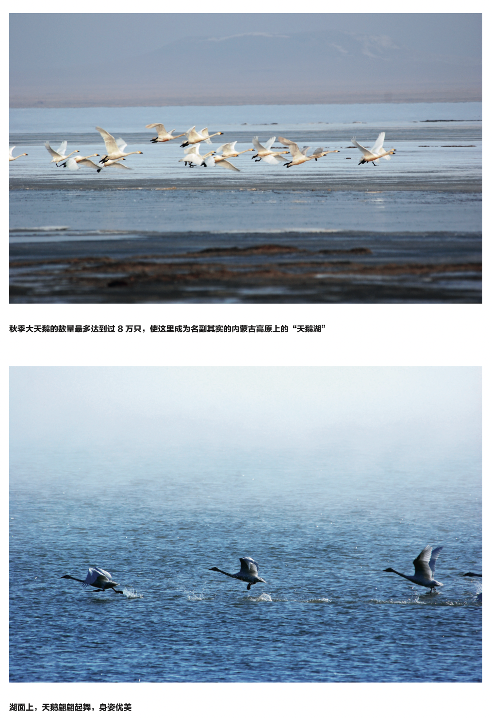 被誉为“草原天鹅湖”的达里诺尔湖,有大天鹅、小天鹅、疣鼻天鹅三种,每年四、五月和九、十月份,大天鹅都会成为达里诺尔胡最显眼的“客人”;