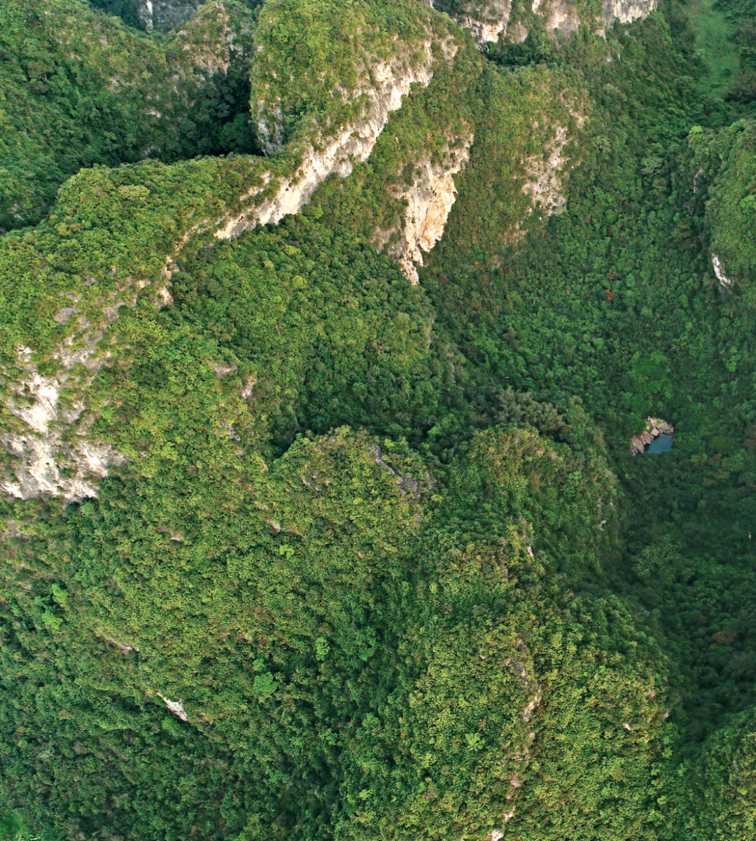 只有通过无人机从高空俯瞰,才能发现洼地中深藏的喀斯特天池。图\《自然中国志·弄岗》摄 刘晟源